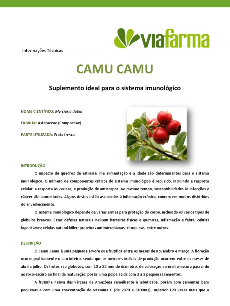 DESCRIO O Camu Camu uma pequena rvore que frutifica entre os meses de novembro e maro. A florao ocorre praticamente o ano inteiro, sendo que os menores ndices de produo ocorrem entre os meses de abril a julho. Os frutos so globosos, com 10 a 32 mm de dimetro, de colorao vermelho-escura passando ao roxo-escuro ao final da maturao, possui uma polpa cida com 2 a 3 pequenas sementes. A frutinha nativa das vrzeas da Amaznia semelhante jabuticaba, porm com sementes bem pequenas e com uma concentrao de Vitamina C (de 2870 a 6100mg), superior 120 vezes mais que a