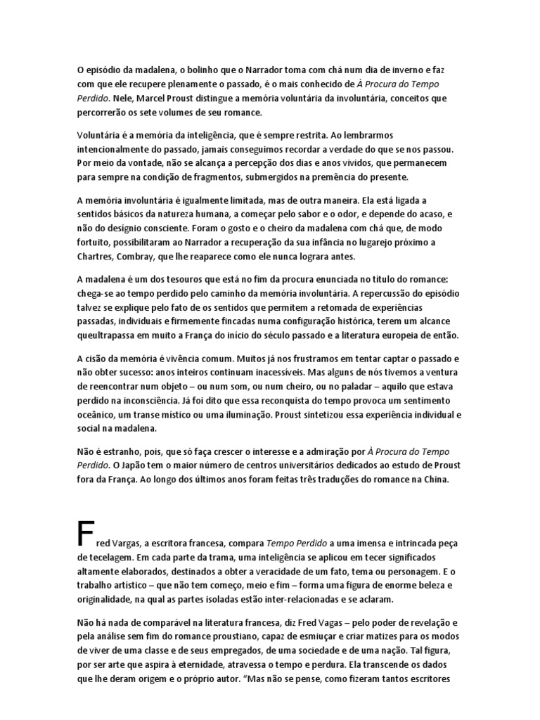 plenamente o passado, o mais conhecido de Procura do Tempo Perdido. Nele, Marcel Proust distingue a memria voluntria da involuntria, conceitos que percorrero os sete volumes de seu romance. Voluntria a memria da inteligncia, que sempre restrita. Ao lembrarmos intencionalmente do passado, jamais conseguimos recordar a verdade do que se nos passou. Por meio da vontade, no se alcana a percepo dos dias e anos vividos, que permanecem para sempre na condio de fragmentos, submergidos na premncia do presente. A memria involuntria igualmente limitada, mas de outra maneira. Ela est ligada a sentidos bsicos da natureza humana, a comear pelo sabor e o odor, e depende do acaso, e no do desgnio consciente. Foram o gosto e o cheiro da madalena com ch que, de modo fortuito, possibilitaram ao Narrador a recuperao da sua infncia no lugarejo prximo a Chartres, Combray, que lhe reaparece como ele nunca lograra antes. A madalena um dos tesouros que est no fim da procura enunciada no ttulo do romance: chega-se ao tempo perdido pelo caminho da memria involuntria. A repercusso do episdio talvez se explique pelo fato de os sentidos que permitem a retomada de experincias passadas, individuais e firmemente fincadas numa configurao histrica, terem um alcance queultrapassa em muito a Frana do incio do sculo passado e a literatura europeia de ento. A ciso da memria vivncia comum. Muitos j nos frustramos em tentar captar o passado e no obter sucesso: anos inteiros continuam inacessveis. Mas alguns de ns tivemos a ventura de reencontrar num objeto ou num som, ou num cheiro, ou no paladar aquilo que estava perdido na inconscincia. J foi dito que essa reconquista do tempo provoca um sentimento ocenico, um transe mstico ou uma iluminao. Proust sintetizou essa experincia individual e social na madalena. No estranho, pois, que s faa crescer o interesse e a admirao por Procura do Tempo Perdido. O Japo tem o maior nmero de centros universitrios dedicados ao estudo de Proust fora da Frana. Ao longo dos ltimos anos foram feitas trs tradues do romance na China.