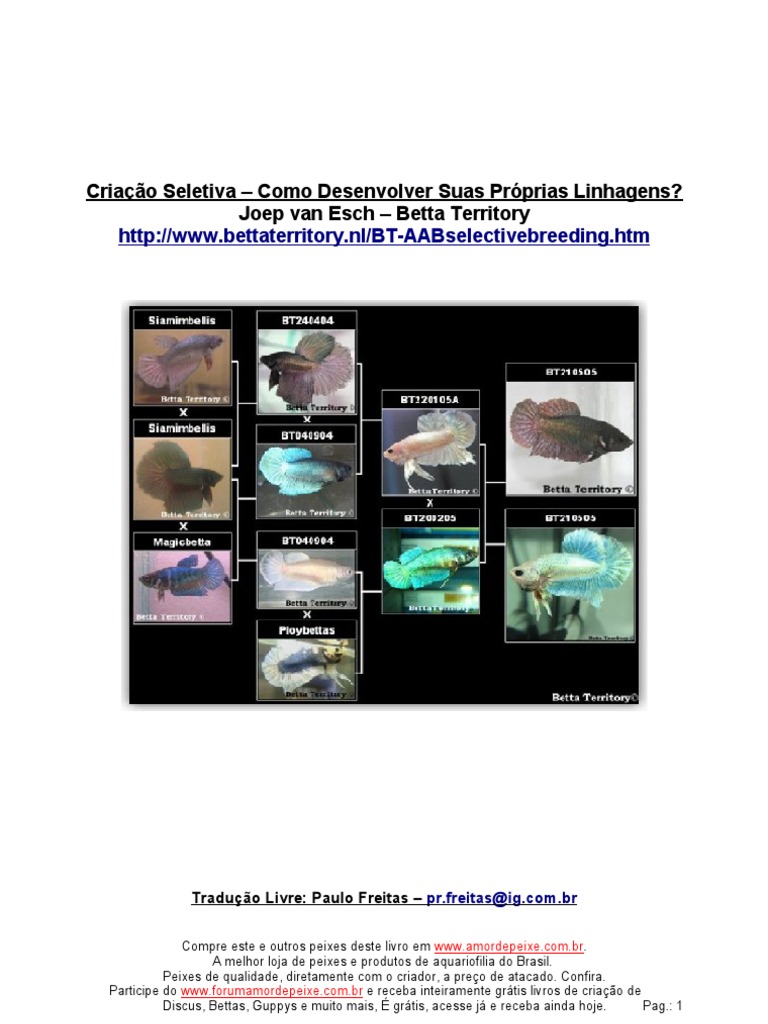 Criao Seletiva Como Desenvolver Suas Prprias Linhagens? Joep van Esch Betta Territory http://www.bettaterritory.nl/BT-AABselectivebreeding.htm Traduo Livre: Paulo Freitas pr.freitas@ig.com.br Com criao seletiva, os hobistas tentam fixar certas caractersticas em suas linhagens. Mas, como iniciar sua prpria linhagem? Com este artigo eu tentarei responder esta questo baseado em meu conhecimento e experincia pessoal. Nota adicional: Nos exemplos 1, 2 e 3 voc encontrar vrios cdigos que eu uso em minhas reprodues. Eu os utilizo para catalogar meus cruzamentos, isto torna mais fcil checar a carga gentica dos peixes de minha criao. O cdigo de reproduo composto de: (I) BT (Betta Territory) e (II) a data do cruzamento (dia/ms/ano). Uma explicao mais detalhada destes cruzamentos pode ser vista em meu site pessoal, selecionando-se Spawn-log no menu. Todos podem comprar peixes de qualidade, mas nem todos podem criar peixes de qualidade! O processo de reproduo de um casal comprado e o desenvolvimento da primeira gerao de filhotes freqentemente fcil mas ento o criador empaca na dificuldade da questo da escolha de seus futuros reprodutores. Onde comear de seu aqurio de crescimento cheio de filhotes? Normalmente os criadores comeam da premissa de serem aptos a manter ou melhorar a qualidade da linhagem que eles adquiriram inicialmente. Melhorar uma linhagem normalmente tambm significa fazer um outcrossing (N.T: Cruzamento de peixes de parentesco distante ou sem parentesco) com peixes de outras linhagens para trazer caractersticas desejveis as quais deseja fixar nas prximas geraes. Neste momento as pessoas realmente esto criando as suas prprias linhagens. Mas como faz-lo com sucesso? A resposta para esta questo no fcil e existem mltiplos caminhos para alcanar esta meta. Cada criador tenta encontrar o(s) mtodo(s) que ele/ela acha melhor. Criar nossa prpria linhagem na verdade nada mais que um quebra-cabea em que ns experimentamos combinar as peas corretamente e com isso alcanar nossos objetivos.