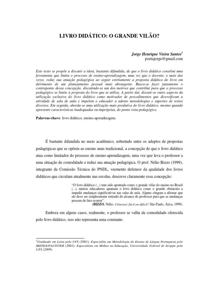 Enfim, o livro didático, como qualquer outra ferramenta pedagógica, não pode ser visto como herói ou vilão do processo educativo em si, uma vez que sua utilização depende da postura do professor. Apontá-lo como herói ou vilão talvez não reflita sua realidade como um recurso didático rico de possibilidades e que está ao alcance do professor e do aluno.
