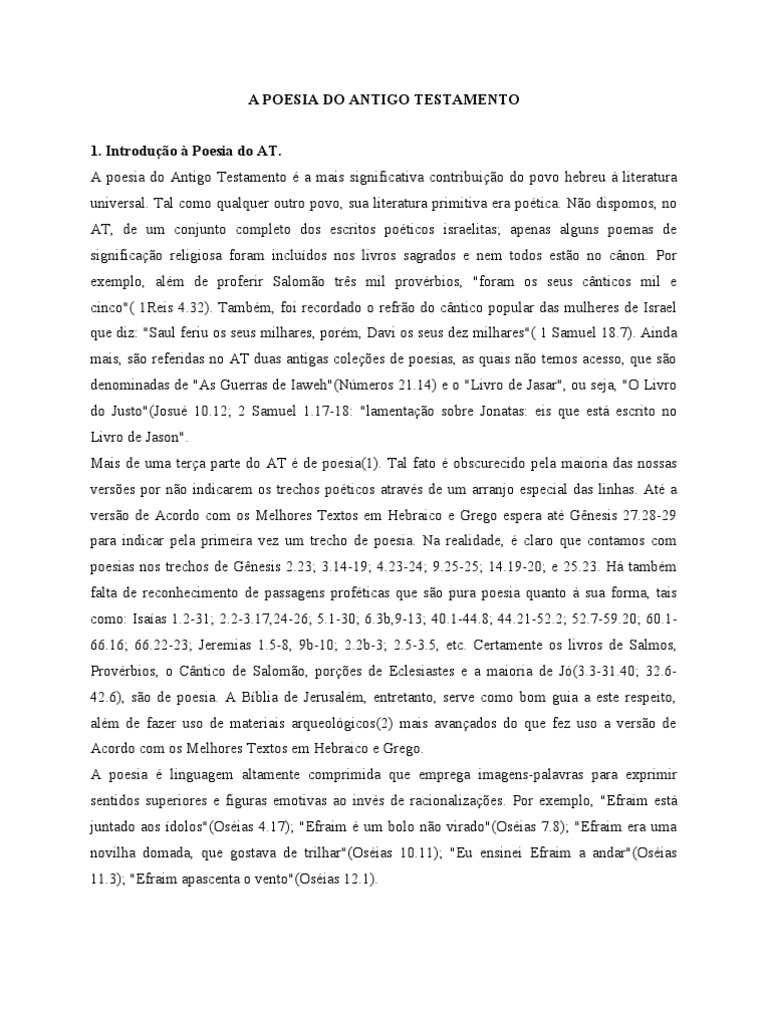 . A poesia do Antigo Testamento a mais significativa contribuio do povo hebreu literatura universal. Tal como qualquer outro povo, sua literatura primitiva era potica. No dispomos, no AT, de um conjunto completo dos escritos poticos israelitas; apenas alguns poemas de significao religiosa foram includos nos livros sagrados e nem todos esto no cnon. Por exemplo, alm de proferir Salomo trs mil provrbios, "foram os seus cnticos mil e cinco"( 1Reis 4.32). Tambm, foi recordado o refro do cntico popular das mulheres de Israel que diz: "Saul feriu os seus milhares, porm, Davi os seus dez milhares"( 1 Samuel 18.7). Ainda mais, so referidas no AT duas antigas colees de poesias, as quais no temos acesso, que so denominadas de "As Guerras de Iaweh"(Nmeros 21.14) e o "Livro de Jasar", ou seja, "O Livro do Justo"(Josu 10.12; 2 Samuel 1.17-18: "lamentao sobre Jonatas: eis que est escrito no Livro de Jason". Mais de uma tera parte do AT de poesia(1). Tal fato obscurecido pela maioria das nossas verses por no indicarem os trechos poticos atravs de um arranjo especial das linhas. At a verso de Acordo com os Melhores Textos em Hebraico e Grego espera at Gnesis 27.28-29 para indicar pela primeira vez um trecho de poesia. Na realidade, claro que contamos com poesias nos trechos de Gnesis 2.23; 3.14-19; 4.23-24; 9.25-25; 14.19-20; e 25.23. H tambm falta de reconhecimento de passagens profticas que so pura poesia quanto sua forma, tais como: Isaas 1.2-31; 2.2-3.17,24-26; 5.1-30; 6.3b,9-13; 40.1-44.8; 44.21-52.2; 52.7-59.20; 60.166.16; 66.22-23; Jeremias 1.5-8, 9b-10; 2.2b-3; 2.5-3.5, etc. Certamente os livros de Salmos, Provrbios, o Cntico de Salomo, pores de Eclesiastes e a maioria de J(3.3-31.40; 32.642.6), so de poesia. A Bblia de Jerusalm, entretanto, serve como bom guia a este respeito, alm de fazer uso de materiais arqueolgicos(2) mais avanados do que fez uso a verso de Acordo com os Melhores Textos em Hebraico e Grego. A poesia linguagem altamente comprimida que emprega imagens-palavras para exprimir sentidos superiores e figuras emotivas ao invs de racionalizaes. Por exemplo, "Efraim est juntado aos dolos"(Osias 4.17); "Efraim um bolo no virado"(Osias 7.8); "Efraim era uma novilha domada, que gostava de trilhar"(Osias 10.11); "Eu ensinei Efraim a andar"(Osias 11.3); "Efraim apascenta o vento"(Osias 12.1).