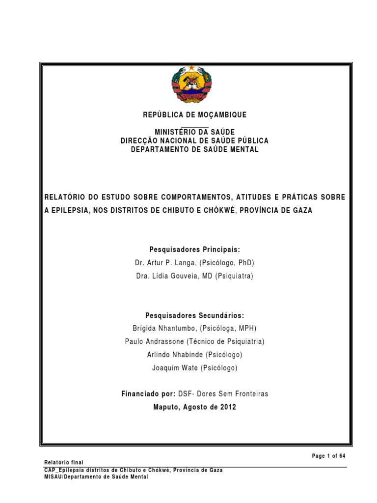 Ttulo da pesquisa: Conhecimentos, Atitudes e Prticas sobre a Epilepsia na Provncia de Gaza Pesquisador Principal: Artur P. Langa. Cel. 824204693 Responsvel e Supervisor da Pesquisa/MISAU: Ldia Gouveia. Cel. 827579550 Responsveis e Supervisores da Pesquisa/DSF: Belmiro Sousa. Cel. 820659130; Carla Ladeira. Cel. 821274550