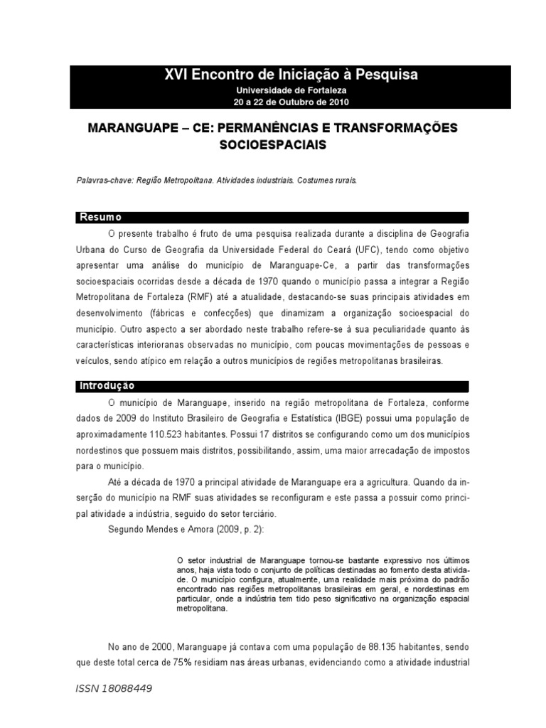 O presente trabalho fruto de uma pesquisa realizada durante a disciplina de Geografia Urbana do Curso de Geografia da Universidade Federal do Cear (UFC), tendo como objetivo apresentar uma anlise do municpio de Maranguape-Ce, a partir das transformaes socioespaciais ocorridas desde a dcada de 1970 quando o municpio passa a integrar a Regio Metropolitana de Fortaleza (RMF) at a atualidade, destacando-se suas principais atividades em desenvolvimento (fbricas e confeces) que dinamizam a organizao socioespacial do municpio. Outro aspecto a ser abordado neste trabalho refere-se sua peculiaridade quanto s caractersticas interioranas observadas no municpio, com poucas movimentaes de pessoas e veculos, sendo atpico em relao a outros municpios de regies metropolitanas brasileiras.