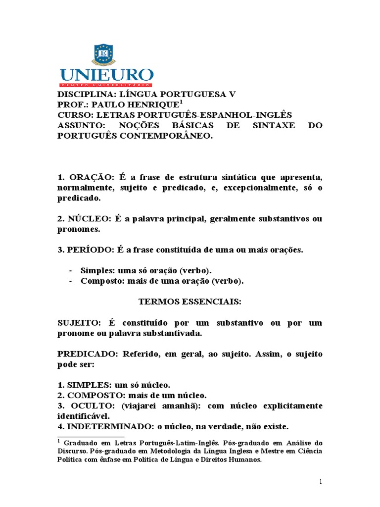 1. ORAO: a frase de estrutura sinttica que apresenta, normalmente, sujeito e predicado, e, excepcionalmente, s o predicado. 2. NCLEO: a palavra principal, geralmente substantivos ou pronomes. 3. PERODO: a frase constituda de uma ou mais oraes. - Simples: uma s orao (verbo). - Composto: mais de uma orao (verbo). TERMOS ESSENCIAIS: SUJEITO: constitudo por um substantivo ou por um pronome ou palavra substantivada. PREDICADO: Referido, em geral, ao sujeito. Assim, o sujeito pode ser: 1. SIMPLES: um s ncleo. 2. COMPOSTO: mais de um ncleo. 3. OCULTO: (viajarei amanh): com ncleo explicitamente identificvel. 4. INDETERMINADO: o ncleo, na verdade, no existe.