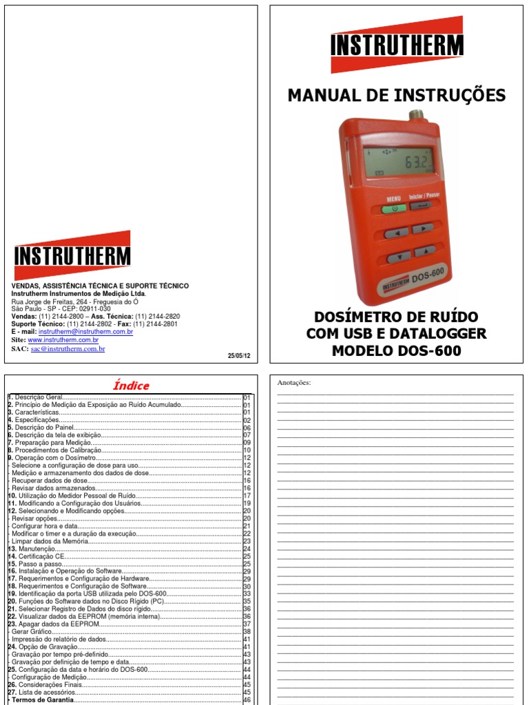1. Descrio Geral.................................................................................................. 01 2. Princpio de Medio da Exposio ao Rudo Acumulado................................. 01 3. Caractersticas.................................................................................................... 01 4. Especificaes.................................................................................................... 02 5. Descrio do Painel............................................................................................ 06 6. Descrio da tela de exibio............................................................................. 07 7. Preparao para Medio................................................................................... 09 8. Procedimentos de Calibrao............................................................................. 10 9. Operao com o Dosmetro................................................................................ 12 - Selecione a configurao de dose para uso......................................................... 12 - Medio e armazenamento dos dados de dose................................................... 12 - Recuperar dados de dose..................................................................................... 16 - Revisar dados armazenados................................................................................ 16 10. Utilizao do Medidor Pessoal de Rudo.......................................................... 17 11. Modificando a Configurao dos Usurios....................................................... 19 12. Selecionando e Modificando opes................................................................ 20 - Revisar opes..................................................................................................... 20 - Configurar hora e data.......................................................................................... 21 - Modificar o timer e a durao da execuo.......................................................... 22 - Limpar dados da Memria.................................................................................... 23 13. Manuteno...................................................................................................... 24 14. Certificao CE................................................................................................. 25 15. Passo a passo................................................................................................... 25 16. Instalao e Operao do Software.................................................................. 29 17. Requerimentos e Configurao de Hardware................................................... 29 18. Requerimentos e Configurao de Software.................................................... 30 19. Identificao da porta USB utilizada pelo DOS-600......................................... 33 20. Funes do Software dados no Disco Rgido (PC).......................................... 35 21. Selecionar Registro de Dados do disco rgido.................................................. 36 22. Visualizar dados da EEPROM (memria interna)............................................. 36 23. Apagar dados da EEPROM.............................................................................. 37 - Gerar Grfico........................................................................................................ 38 - Impresso do relatrio de dados.......................................................................... 41 24. Opo de Gravao.......................................................................................... 41 - Gravao por tempo pr-definido......................................................................... 43 - Gravao por definio de tempo e data.............................................................. 43 25. Configurao da data e horrio do DOS-600................................................... 44 - Configurao de Medio..................................................................................... 44 26. Consideraes Finais....................................................................................... 45 27. Lista de acessrios........................................................................................... 45 Termos de Garantia............................................................................................ 46