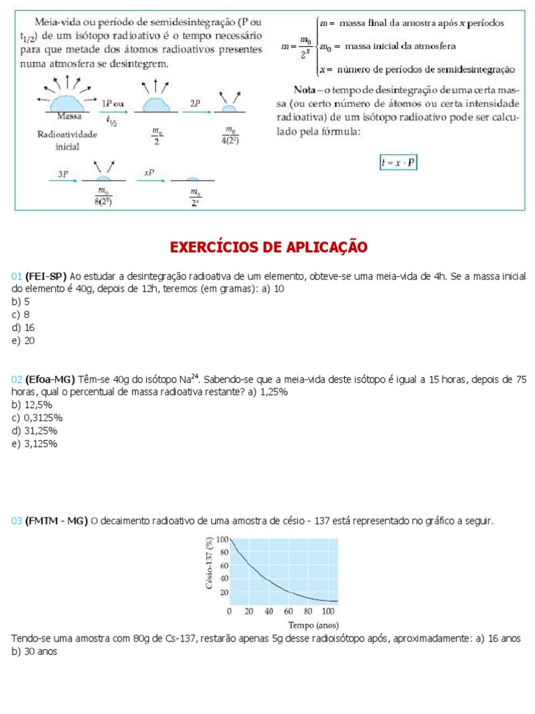 01 (FEI-SP) Ao estudar a desintegrao radioativa de um elemento, obteve-se uma meia-vida de 4h. Se a massa inicial do elemento 40g, depois de 12h, teremos (em gramas): a) 10 b) 5 c) 8 d) 16 e) 20