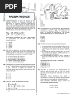 30 (FATEC-SP) Em abril de 1986, um nome ficou na memria da humanidade: Chernobyl. Neste ano "comemoram-se" os 20 anos do pior acidente da histria da indstria nuclear. Supondo-se ser o Sr - 90, (cuja meia-vida de 28 anos) a nica contaminao radioativa, em 2098 a quantidade desse istopo ter se reduzido a a) 1/2 da quantidade inicialmente presente. b) 1/4 da quantidade inicialmente presente. c) 1/8 da quantidade inicialmente presente. d) 1/16 da quantidade inicialmente presente. e) 1/32 da quantidade inicialmente presente. 31 (FUVEST-SP) O istopo radioativo Cu-64 sofre decaimento , conforme representado: