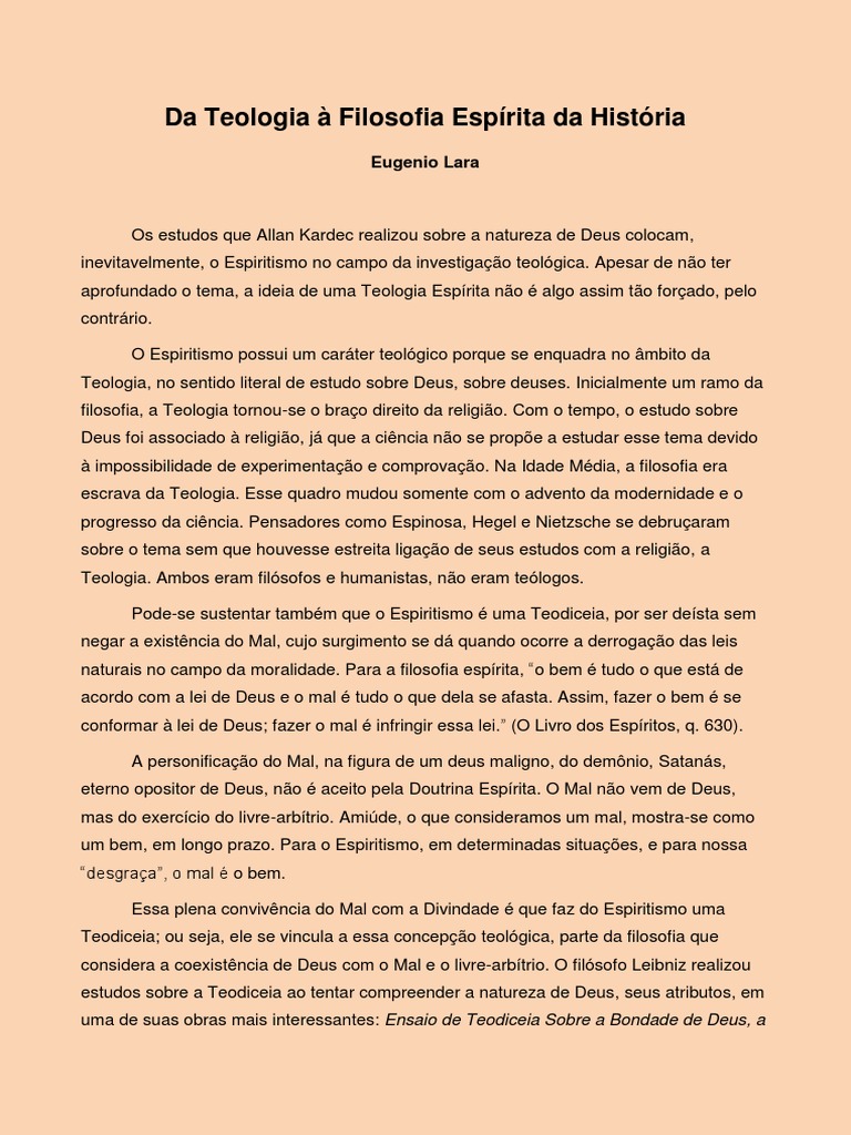 Liberdade do Homem e a Origem do Mal, que Kardec deve ter lido, assim como certamente estudou a tica, de Espinosa. No poderamos deixar de lado os estudos teolgicos sobre Deus e seus atributos por Fnelon que, alis, foi um dos grandes colaboradores da equipe dO Esprito de Verdade. Em nosso entender, alm desses autores citados, a filosofia grega, Descartes e a Teologia crist desempenharam grande influncia na abordagem que Allan Kardec faz sobre Deus, notadamente devido sua formao humanista e crist. O fato de o Espiritismo possuir uma Teologia e uma Teodiceia, no significa que sua viso de mundo seja teolgica, dogmtica, calcada em preceitos religiosos, em algum artigo de f. O Cristianismo, por exemplo, nos conduz a uma Teologia enquanto que o Espiritismo, de modo diferenciado, nos leva a conceber uma Filosofia da Histria, melhor dizendo, a uma Filosofia Esprita da Histria. Para o Cristianismo, a figura histrica de Jesus Cristo o prprio Deus, o Verbo que se fez Carne, que se manifestou historicamente a fim de salvar o homem do pecado. O Cristianismo tem como objetivo primordial a salvao do homem. Isto incontestvel. Enquanto que o Espiritismo, em que pese a influncia crist, no salvacionista porque sua finalidade a evoluo do homem, a evoluo intelecto-moral, contnua e permanente. Por conseguinte, um equvoco imaginar que a filosofia esprita tenha da histria uma viso teolgica, calcada no cristianismo, como se fosse um neocristianismo, o Cristianismo Redivivo, ressuscitado ou mesmo reencarnado. No sentido estrito do termo, repetimos, o Espiritismo sim uma modalidade de Teologia por se propor a estudar, a analisar e tentar conceituar Deus como causa primordial, enquanto Inteligncia Suprema, com supostos atributos. Porm, isto no quer dizer que sua viso do processo histrico seja fundamentada em uma viso teolgica. Trocando em midos, a concepo que o Espiritismo tem do processo histrico teleolgica, jamais teolgica. Ao descartarmos o teologismo cristo na anlise dos fatos histricos, surgem outras questes. Seria essa concepo esprita da histria dedutvel dos princpios nucleares do Espiritismo , dialtica? Seria ela libertria, holstica, monista ou positivista? Essa dialtica na anlise histrica platnica ou aristotlica, hegeliana ou marxista? necessrio avanar nessa discusso. Ficar de rabo preso com o Cristianismo pode satisfazer aos anseios religiosos de muitos confrades e se torna um prato cheio para