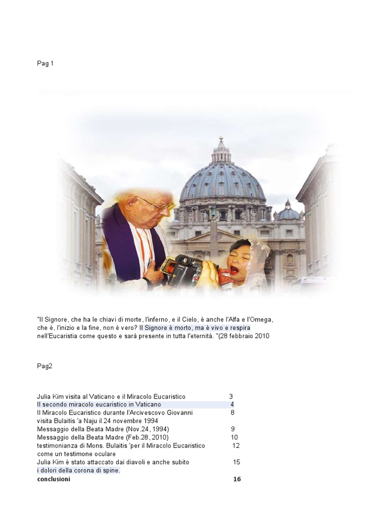 Julia Kim visita al Vaticano e il Miracolo Eucaristico Il secondo miracolo eucaristico in Vaticano Il Miracolo Eucaristico durante l'Arcivescovo Giovanni visita Bulaitis 'a Naju il 24 novembre 1994 Messaggio della Beata Madre (Nov.24, 1994) Messaggio della Beata Madre (Feb.28, 2010) testimonianza di Mons. Bulaitis 'per il Miracolo Eucaristico come un testimone oculare Julia Kim stato attaccato dai diavoli e anche subito i dolori della corona di spine.