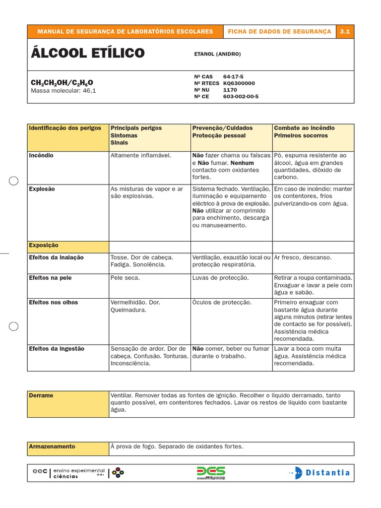 Líquido incolor com odor característico. Ponto de ebulição: 79∞C Ponto de fusão: -117∞C Densidade relativa: 0,8 Solubilidade na água: miscível. Pressão de vapor, kPa a 20∞C: 5,8 Densidade relativa do vapor (ar=1): 1,6 Densidade relativa da mistura vapor/ar a 20∞C (ar=1): 1,03 Ponto de inflamação: 13∞C Temperatura de auto-ignição: 363∞C Limite explosividade, % de volume no ar: 3,3-19 |