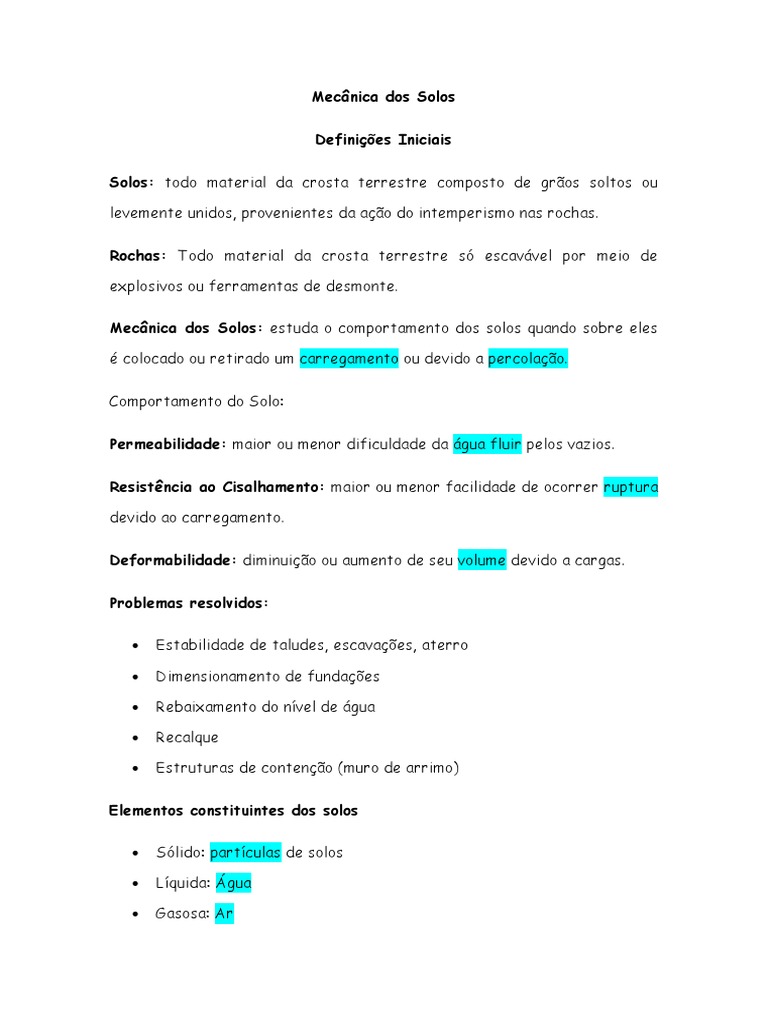 provenientes da ao do intemperismo nas rochas. Rochas: Todo material da crosta terrestre s escavvel por meio de explosivos ou ferramentas de desmonte. Mecnica dos Solos: estuda o comportamento dos solos quando sobre eles colocado ou retirado um carregamento ou devido a percolao. Comportamento do Solo: Permeabilidade: maior ou menor dificuldade da gua fluir pelos vazios. Resistncia ao Cisalhamento: maior ou menor facilidade de ocorrer ruptura devido ao carregamento. Deformabilidade: diminuio ou aumento de seu volume devido a cargas. Problemas resolvidos: Estabilidade de taludes, escavaes, aterro Dimensionamento de fundaes Rebaixamento do nvel de gua Recalque Estruturas de conteno (muro de arrimo)