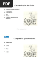 Grossas (2 mm a 4,8 mm) Mdias (0,42 mm a 2 mm) Finas (0,05 mm a 0,42 mm) Siltes Orgnicos (matria orgnica com Finos (0,005 mm a 0,05 mm) plasticidade) (no granulares) Inorgnicos (pouca ou nenhuma plasticidade) Argila Orgnicos (cor escura ou preta (menor que 0,005) com odor caracterstico) Inorgnicos (cinza, azulada ou amarela) Orgnicos Turfas (composto de matria orgnica vegetal decomposta (sem definio ou em decomposio , fibrosa, pouco densa e combustvel granulomtrica) quando seca.) Conchas (restos de carapaas de animais marinhos)