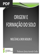 Areias e Pedregulhos: so agregados no coesivos de fragmentos de rochas ou minerais de forma arredondada ou granulosa. Siltes inorgnicos: gros finos com pequena (partculas em escamas) ou quase nenhuma (gros de quartzo) plasticidade. Siltes Orgnicos: gros finos mais ou menos plsticos. Argilas: agregado de partculas microscpicas e submicroscpicas. plstica com certo teor de umidade e muito dura quando seca. Origem dos Solos (provem do intemperismo das rochas) Desintegrao Mecnica: Temperatura, gua, vegetao, vento, gelo,