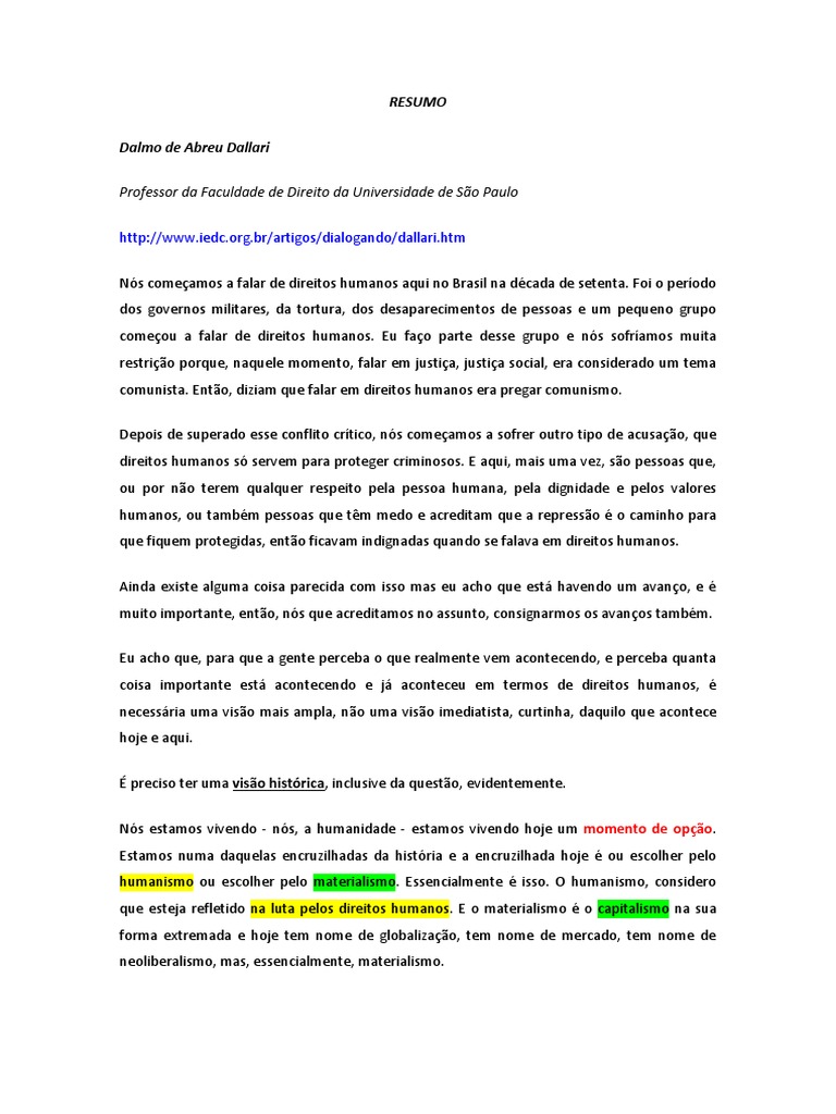 RESUMO Dalmo de Abreu Dallari Professor da Faculdade de Direito da Universidade de So Paulo [Link]