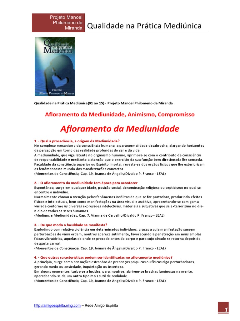 1. - Qual a procedência, a origem da Mediunidade? No complexo mecanismo da consciência humana, a paranormalidade desabrocha, alargando horizontes da percepção em torno das realidade profundas do ser e da vida. A mediunidade, que vige latente no organismo humano, aprimora-se com o contributo da consciência de responsabilidade e mediante a atenção que o exercício da sua função bem direcionada lhe conceda. Faculdade da consciência superior ou Espírito imortal, reveste-se dos órgãos físicos que lhe exteriorizam os fenômenos no mundo das manifestações concretas (Momentos de Consciência, Cap. 19, Joanna de Ângelis/Divaldo P. Franco - LEAL) 2. - O afloramento da mediunidade tem época para acontecer Espontânea, surge em qualquer idade, posição social, denominação religiosa ou cepticismo no qual se encontre o individuo. Normalmente chama a atenção pelos fenômenos insólitos de que se faz portadora, produzindo efeitos físicos e intelectuais, bem como manifestações na área visual e auditiva, apresentando-se com gama variada conforme as diversas expressões intelectuais, materiais e subjetivas que se exteriorizam no diaa-dia de todos os seres humanos. (Médiuns e Mediunidades, Cap. 7, Vianna de Carvalho/Divaldo P. Franco - LEAL) 3. - De que modo a faculdade se manifesta? Explodindo com relativa violência em determinados indivíduos, graças a cuja manifestação surgem perturbações de vária ordem, noutros aparece sutilmente, favorecendo a penetração em mais amplas faixas vibratórias, aquelas de onde se procede antes do corpo e para cujo círculo se retorna depois do desgaste carnal. (Momentos de Consciência, Cap. 19, Joanna de Ângelis/Divaldo P. Franco - LEAL) 4. - Que outras características podem ser identificadas no afloramento mediúnico? A princípio, surge como sensações estranhas de presenças psíquicas ou físicas algo perturbadoras, gerando medo ou ansiedade, inquietação ou incerteza. Em alguns momentos, turba-se a lucidez, para, noutros, abrirem-se brechas luminosas na mente, apercebendo-se de um outro tipo mais sutil de realidade. (Momentos de Consciência, Cap. 19, Joanna de Ângelis/Divaldo P. Franco - LEAL)