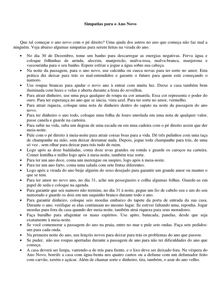 Que tal comear o ano novo com o p direito? Uma ajuda dos astros no ano que comea no faz mal a ningum. Veja abaixo algumas simpatias para serem feitas na virada do ano. No dia 30 de Dezembro, tome um banho para descarregar as energias negativas. Ferva gua e coloque folhinhas de arruda, alecrim, manjerico, malva-rosa, malva-branca, manjerona e vassourinha para o seu banho. Espere esfriar e jogue a gua sobre sua cabea. Na noite da passagem, para o ano novo, use calcinha ou cueca novas para ter sorte no amor. Esta prtica diz deixar para trs os mal-entendidos e garante o futuro para quem est comeando o namoro. Use roupas brancas para ajudar o novo ano entrar com muita luz. Deixe a casa tambm bem iluminada com luzes e velas e aberta durante a festa do reveillon. Para atrair dinheiro, use uma pea qualquer de roupa na cor amarela. Essa cor representa o poder do ouro. Para ter esperana no ano que se inicia, vista azul. Para ter sorte no amor, vermelho. Para atrair riqueza, coloque uma nota de dinheiro dentro do sapato na noite da passagem do ano novo. Para ter dinheiro o ano todo, coloque uma folha de louro enrolada em uma nota de qualquer valor, passe canela e guarde na carteira. Para subir na vida, suba um degrau de uma escada ou em uma cadeira com o p direito assim que der meia-noite. Pule com o p direito meia-noite para atrair coisas boas para a vida. D trs pulinhos com uma taa de champanhe na mo, sem deixar derramar nada. Depois, jogue toda champanhe para trs, de uma s vez , sem olhar para deixar para trs tudo de ruim. Logo aps as doze badaladas, coma doze uvas grandes ou roms e guarde os caroos na carteira. Comer lentilha e milho logo aps meia-noite, tambm traz sorte. Para ter um ano doce, coma um merengue ou suspiro, logo aps meia-noite. Para ter um ano farto, coma uma salada com sete frutas diferentes. Logo aps a virada do ano beije algum do sexo desejado para garantir um grande amor ou manter o que se tem. Para ter amor no novo ano, no dia 31, ache um pessegueiro e colha algumas folhas. Guarde-as em papel de seda e coloque na agenda. Para garantir que seu namoro no termine, no dia 31 noite, pegue um fio de cabelo seu e um do seu namorado e guarde os dois em um saquinho branco durante todo o ano. Para garantir dinheiro, coloque seis moedas embaixo do tapete da porta de entrada da sua casa. Durante o ano, verifique se elas continuam no mesmo lugar. Se estiver faltando uma, reponha. Jogar moedas para fora da casa quando der meia-noite, tambm atrai riqueza para seus moradores. Faa barulho para afugentar os maus espritos. Use apito, batucada, panelas, desde que seja exatamente meia-noite. Se voc comemorar a passagem do ano na praia, entre no mar e pule sete ondas. Faa sete pedidos: um para cada onda. Na primeira noite do ano, use lenis novos para deixar para trs os problemas do ano que passou. Se puder, no use roupas apertadas durante a passagem de ano para no ter dificuldades do ano que comea. A casa dever ser limpa, varrendo-a de trs para frente, e o lixo deve ser deixado fora. Na vspera do Ano Novo, borrife a casa com gua-benta nos quatro cantos ou a defume com um defumador feito com carvo, xerm e acar. Alm de chamar sorte e dinheiro, tira, tambm, o azar do ano velho.