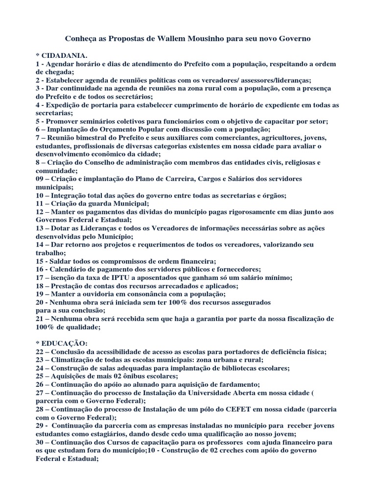 * CIDADANIA. 1 - Agendar horrio e dias de atendimento do Prefeito com a populao, respeitando a ordem de chegada; 2 - Estabelecer agenda de reunies polticas com os vereadores/ assessores/lideranas; 3 - Dar continuidade na agenda de reunies na zona rural com a populao, com a presena do Prefeito e de todos os secretrios; 4 - Expedio de portaria para estabelecer cumprimento de horrio de expediente em todas as secretarias; 5 - Promover seminrios coletivos para funcionrios com o objetivo de capacitar por setor; 6 Implantao do Oramento Popular com discusso com a populao; 7 Reunio bimestral do Prefeito e seus auxiliares com comerciantes, agricultores, jovens, estudantes, profissionais de diversas categorias existentes em nossa cidade para avaliar o desenvolvimento econmico da cidade; 8 Criao do Conselho de administrao com membros das entidades civis, religiosas e comunidade; 09 Criao e implantao do Plano de Carreira, Cargos e Salrios dos servidores municipais; 10 Integrao total das aes do governo entre todas as secretarias e rgos; 11 Criao da guarda Municipal; 12 Manter os pagamentos das dividas do municpio pagas rigorosamente em dias junto aos Governos Federal e Estadual; 13 Dotar as Lideranas e todos os Vereadores de informaes necessrias sobre as aes desenvolvidas pelo Municpio; 14 Dar retorno aos projetos e requerimentos de todos os vereadores, valorizando seu trabalho; 15 - Saldar todos os compromissos de ordem financeira; 16 - Calendrio de pagamento dos servidores pblicos e fornecedores; 17 iseno da taxa de IPTU a aposentados que ganham s um salrio mnimo; 18 Prestao de contas dos recursos arrecadados e aplicados; 19 Manter a ouvidoria em consonncia com a populao; 20 - Nenhuma obra ser iniciada sem ter 100% dos recursos assegurados para a sua concluso; 21 Nenhuma obra ser recebida sem que haja a garantia por parte da nossa fiscalizao de 100% de qualidade; * EDUCAO: 22 Concluso da acessibilidade de acesso as escolas para portadores de deficincia fsica; 23 Climatizao de todas as escolas municipais: zona urbana e rural; 24 Construo de salas adequadas para implantao de bibliotecas escolares; 25 Aquisies de mais 02 nibus escolares; 26 Continuao do apio ao alunado para aquisio de fardamento; 27 Continuao do processo de Instalao da Universidade Aberta em nossa cidade ( parceria com o Governo Federal); 28 Continuao do processo de Instalao de um plo do CEFET em nossa cidade (parceria com o Governo Federal); 29 - Continuao da parceria com as empresas instaladas no municpio para receber jovens estudantes como estagirios, dando desde cedo uma qualificao ao nosso jovem; 30 Continuao dos Cursos de capacitao para os professores com ajuda financeiro para os que estudam fora do municpio;10 - Construo de 02 creches com apio do governo Federal e Estadual;