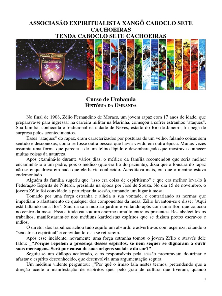 Uma pessoa na reunião pergunta se ele sentia falta de alguma coisa que tinha deixado na terra e ele responde: "_Minha caximba. Tenda Espírita Oxalá. No dia seguinte. até hoje usadas pelos membros da Tenda e carinhosamente chamada de "Guia de Pai Antonio". e militares que recorriam ao poder mediúnico de Zélio para a cura de parentes enfermos e os vendo recuperados. Tenda Espírita São Jorge. nêgo fica aqui mesmo. Nesse mesmo dia incorporou um preto velho chamado Pai Antônio. Nêgo qué o pito que deixou no toco. Nêgo fica no toco que é lugá di nego. entidade com grande experiência no desmanche de trabalhos de baixa magia. apesar de inúmeras vezes isto ser oferecido a ele. que segundo o que dizem parecia um albergue." Tal afirmativa deixou os presentes perplexos. vestimenta branca. cegos etc. cuja manifestação mediúnica fora considerada loucura. As guias usadas são apenas as que 3 . Zélio Fernandino de Moraes nunca fez da religião sua profissão. continuou dizendo outras palavras representando a sua humildade.O caboclo foi atender um paralítico. foram fundadas mais de 10. Foi Pai Antonio também a primeira entidade a solicitar uma guia. difusão e sedimentação da religião de Umbanda. aquele que. Passou a atender outras pessoas que haviam neste local. cocares. "_Não os aceite. o mesmo teve como causa o fato de naquela época não se poder registrar o nome Umbanda." Assim. Manda mureque busca. verdadeira romaria formou-se na rua Floriano Peixoto. Médiuns. A partir daí. ordenava sempre o Caboclo. Nunca aceitara ajuda monetária de ninguém era ordem do seu guia chefe. tinha como auxiliar o Caboclo orixá Malé. Em 1918. Devolva-os!". Ministros. com cânticos baixos e harmoniosos. proibição de sacrifícios de animais. com fala mansa. além das pessoas que se hospedavam em sua casa para os tratamentos espirituais.000 tendas a partir das mencionadas. ou preenchendo cheques vultosos. procuravam retribuir o benefício através de presentes. e quanto aos nomes de santos. era uma maneira de estabelecer um ponto de referência para fiéis da religião católica que procuravam os préstimos da Umbanda. Dispensou os atabaques e as palmas. Tenda Espírita Nossa Senhora da Conceição. Capacetes. o Caboclo das Sete Encruzilhadas começou a trabalhar incessantemente para o esclarecimento. o Caboclo das Sete Encruzilhadas recebeu ordens do Astral Superior para fundar sete tendas para a propagação da Umbanda. A respeito do uso do termo espírita e de nomes de santos católicos nas tendas fundadas." Após insistência dos presentes fala: "_Num carece preocupá não. e Tenda Espírita São Gerônimo. recusava-se a sentar-se junto com os presentes à mesa dizendo as seguintes palavras: "_ Nêgo num senta não meu sinhô. O ritual estabelecido pelo Caboclo das Sete Encruzilhadas era bem simples. Enquanto Zélio estava encarnado. pois sua missão mediúnica não o permitiu. Isso é coisa de sinhô branco e nêgo deve arrespeitá. Embora não seguindo a carreira militar para a qual se preparava. Enfermos. vestimentas de cor. Trabalhava para o sustento de sua família e diversas vezes contribuiu financeiramente para manter os templos que o Caboclo das Sete Encruzilhadas fundou. espadas. rendas e lamês não seriam aceitos. Além de Pai Antônio. os quais estavam presenciando a solicitação do primeiro elemento de trabalho para esta religião. foi confundido como loucura de seu aparelho e com palavras de muita sabedoria e humildade e com timidez aparente. em nome de Jesus. vinham em busca de cura e ali a encontravam. As agremiações ganharam os seguintes nomes: Tenda Espírita Nossa Senhora da Guia. Tenda Espírita São Pedro. deixaram os sanatórios e deram provas de suas qualidades excepcionais. fazendo este ficar curado. Tenda Espírita Santa Bárbara. industriais. praticando suas curas.