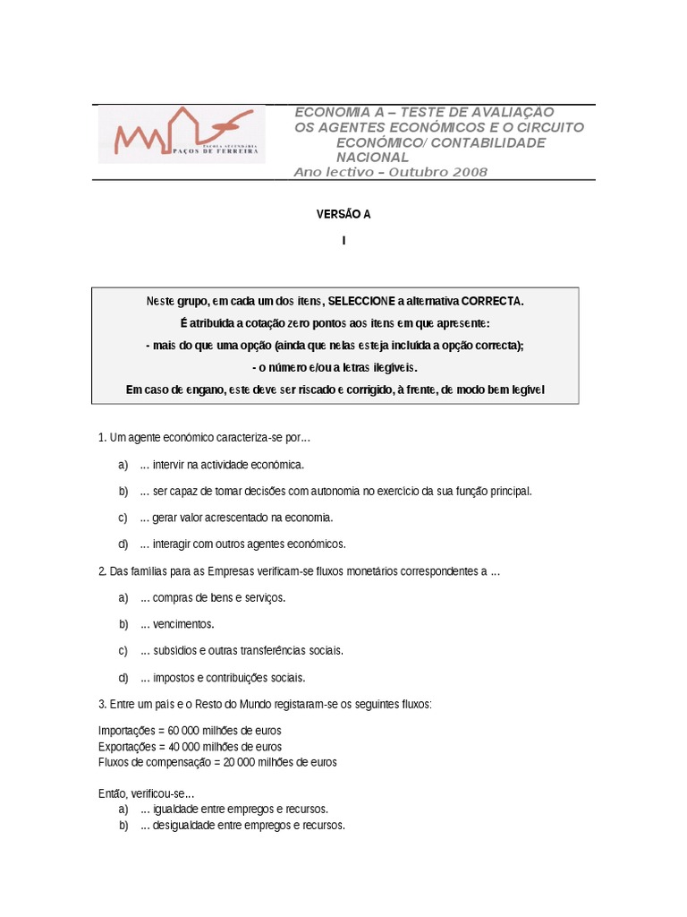 1. Um agente econmico caracteriza-se por a) intervir na actividade econmica. b) ser capaz de tomar decises com autonomia no exerccio da sua funo principal. c) gerar valor acrescentado na economia. d) interagir com outros agentes econmicos. 2. Das famlias para as Empresas verificam-se fluxos monetrios correspondentes a a) compras de bens e servios. b) vencimentos. c) subsdios e outras transferncias sociais. d) impostos e contribuies sociais. 3. Entre um pas e o Resto do Mundo registaram-se os seguintes fluxos: Importaes = 60 000 milhes de euros Exportaes = 40 000 milhes de euros Fluxos de compensao = 20 000 milhes de euros Ento, verificou-se a) igualdade entre empregos e recursos. b) desigualdade entre empregos e recursos.
