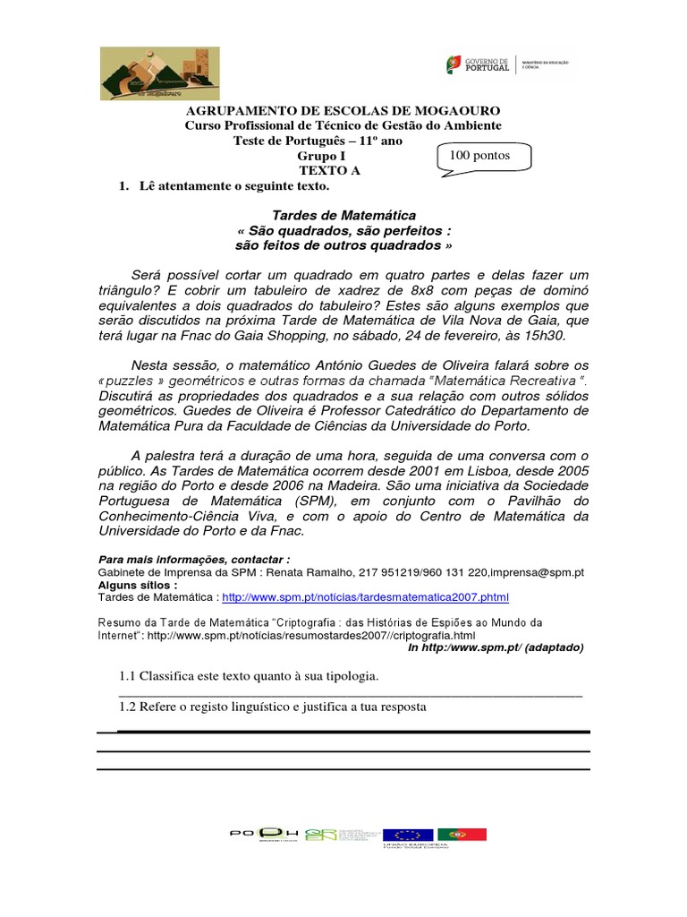 I TEXTO A 1. Lê atentamente o seguinte texto. Tardes de Matemática « São quadrados, são perfeitos : são feitos de outros quadrados » Será possível cortar um quadrado em quatro partes e delas fazer um triângulo? E cobrir um tabuleiro de xadrez de 8x8 com peças de dominó equivalentes a dois quadrados do tabuleiro? Estes são alguns exemplos que serão discutidos na próxima Tarde de Matemática de Vila Nova de Gaia, que terá lugar na Fnac do Gaia Shopping, no sábado, 24 de fevereiro, às 15h30. Nesta sessão, o matemático António Guedes de Oliveira falará sobre os «puzzles » geométricos e outras formas da chamada “Matemática Recreativa “. Discutirá as propriedades dos quadrados e a sua relação com outros sólidos geométricos. Guedes de Oliveira é Professor Catedrático do Departamento de Matemática Pura da Faculdade de Ciências da Universidade do Porto. A palestra terá a duração de uma hora, seguida de uma conversa com o público. As Tardes de Matemática ocorrem desde 2001 em Lisboa, desde 2005 na região do Porto e desde 2006 na Madeira. São uma iniciativa da Sociedade Portuguesa de Matemática (SPM), em conjunto com o Pavilhão do Conhecimento-Ciência Viva, e com o apoio do Centro de Matemática da Universidade do Porto e da Fnac.