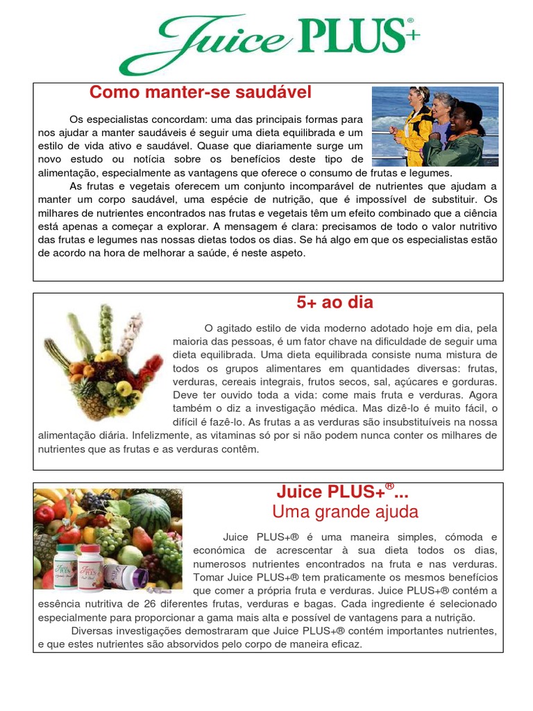 Juice PLUS+ proporciona uma nutrio integral, includa nos sumos concentrados de 26 frutas, verduras e bagas. Cada ingrediente selecionado para proporcionar uma grande variedade de benefcios nutricionais. Juice PLUS+ um complemento para uma dieta saudvel. Juice PLUS+ uma forma fcil, cmoda e econmica de adicionar os nutrientes das frutas e verduras sua dieta diria. Juice PLUS+ est suportado pela investigao clnica levada a cabo por investigadores dos principais hospitais e universidades em todo o mundo e publicada em revistas cientficas especializadas. Recomendado por milhares de mdicos e profissionais da sade em todo o mundo.