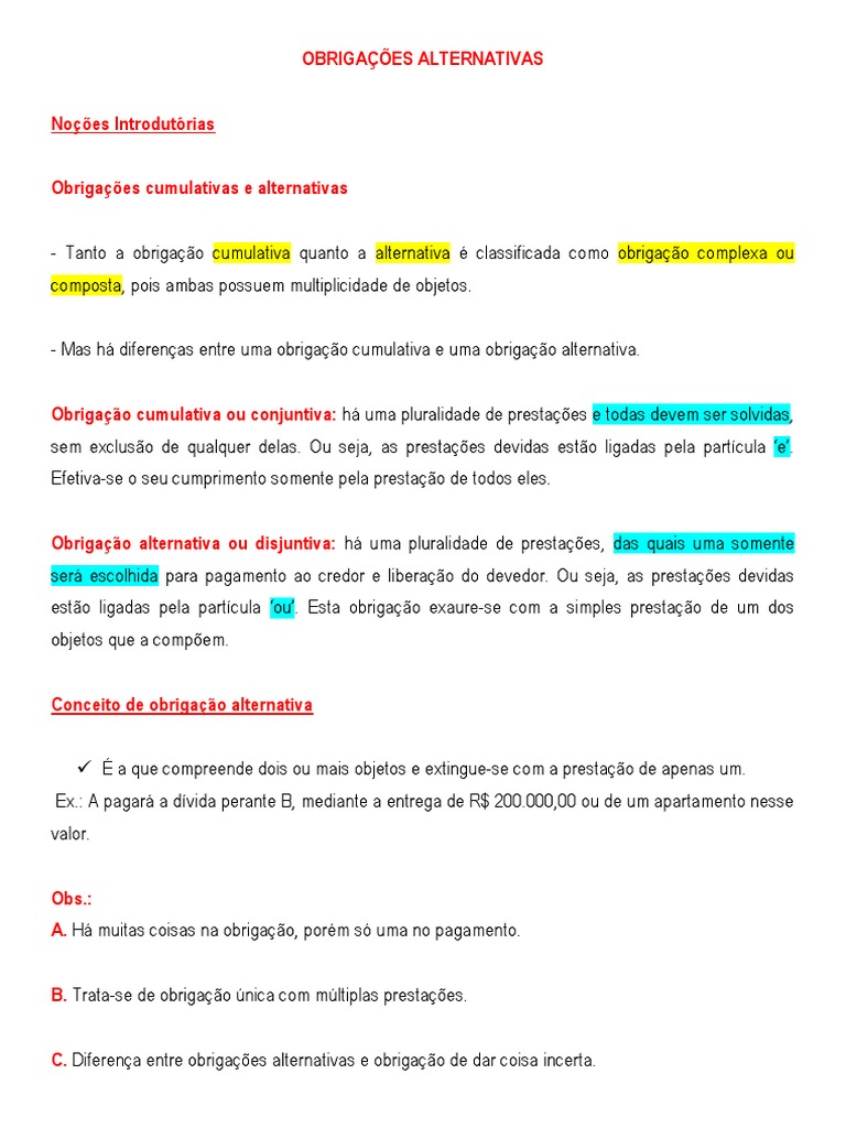 o complexa ou composta, pois ambas possuem multiplicidade de objetos. - Mas h diferenas entre uma obrigao cumulativa e uma obrigao alternativa. Obrigao cumulativa ou conjuntiva: h uma pluralidade de prestaes e todas devem ser solvidas, sem excluso de qualquer delas. Ou seja, as prestaes devidas esto ligadas pela partcula e. Efetiva-se o seu cumprimento somente pela prestao de todos eles. Obrigao alternativa ou disjuntiva: h uma pluralidade de prestaes, das quais uma somente ser escolhida para pagamento ao credor e liberao do devedor. Ou seja, as prestaes devidas esto ligadas pela partcula ou. Esta obrigao exaure-se com a simples prestao de um dos objetos que a compem. Conceito de obrigao alternativa a que compreende dois ou mais objetos e extingue-se com a prestao de apenas um. Ex.: A pagar a dvida perante B, mediante a entrega de R$ 200.000,00 ou de um apartamento nesse valor. Obs.: A. H muitas coisas na obrigao, porm s uma no pagamento. B. Trata-se de obrigao nica com mltiplas prestaes. C. Diferena entre obrigaes alternativas e obrigao de dar coisa incerta.