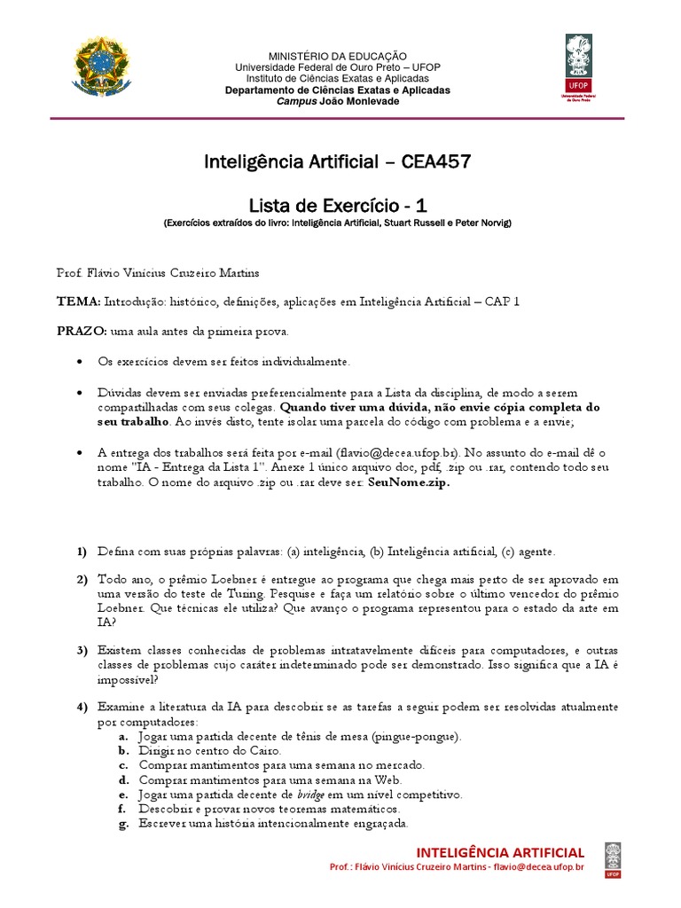 Prof. Flvio Vincius Cruzeiro Martins TEMA: Introduo: histrico, definies, aplicaes em Inteligncia Artificial CAP 1 PRAZO: uma aula antes da primeira prova. Os exerccios devem ser feitos individualmente. Dvidas devem ser enviadas preferencialmente para a Lista da disciplina, de modo a serem compartilhadas com seus colegas. Quando tiver uma dvida, no envie cpia completa do seu trabalho. Ao invs disto, tente isolar uma parcela do cdigo com problema e a envie; A entrega dos trabalhos ser feita por e-mail (flavio@decea.ufop.br). No assunto do e-mail d o nome "IA - Entrega da Lista 1". Anexe 1 nico arquivo doc, pdf, .zip ou .rar, contendo todo seu trabalho. O nome do arquivo .zip ou .rar deve ser: SeuNome.zip.