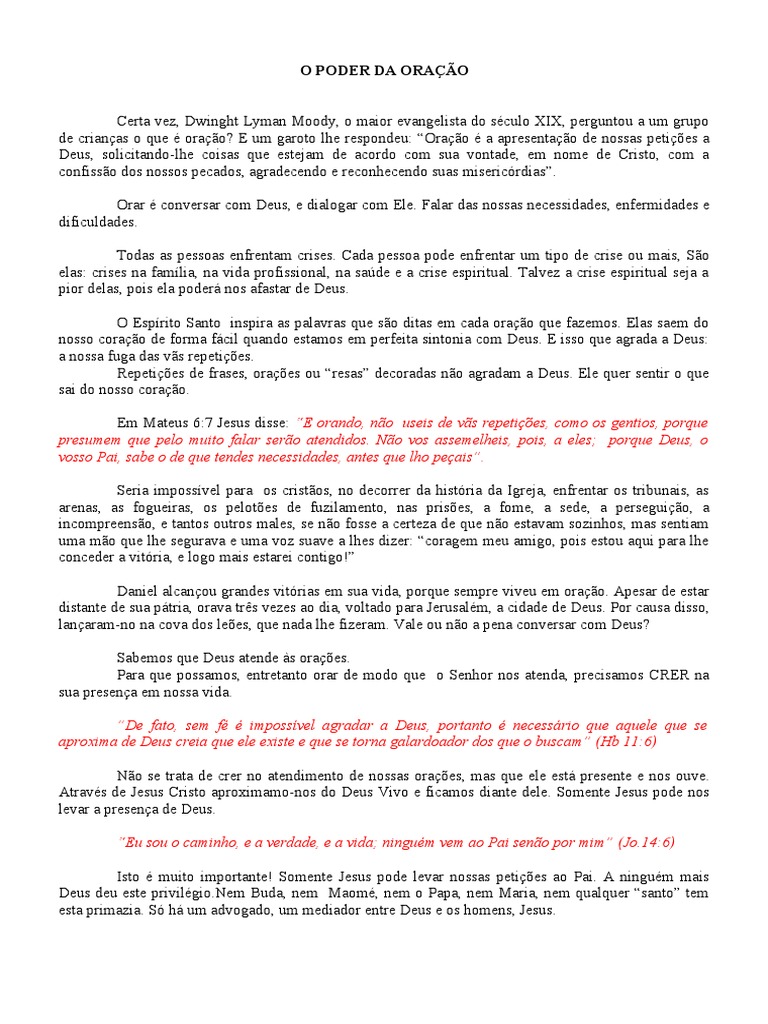 ora o! " um garoto lhe respondeu# $%ra o a apresenta o de nossas peti&es a Deus, solicitando'lhe coisas que este(am de acordo com sua vontade, em nome de Cristo, com a con)iss o dos nossos pecados, agradecendo e reconhecendo suas miseric*rdias+, %rar conversar com Deus, e dialogar com "le, -alar das nossas necessidades, en)ermidades e di)iculdades, .odas as pessoas en)rentam crises, Cada pessoa pode en)rentar um tipo de crise ou mais, / o elas# crises na )am0lia, na vida pro)issional, na sa1de e a crise espiritual, .alvez a crise espiritual se(a a pior delas, pois ela poder2 nos a)astar de Deus, % "sp0rito /anto inspira as palavras que s o ditas em cada ora o que )azemos, "las saem do nosso cora o de )orma )2cil quando estamos em per)eita sintonia com Deus, " isso que agrada a Deus# a nossa )uga das v s repeti&es, 3epeti&es de )rases, ora&es ou $resas+ decoradas n o agradam a Deus, "le quer sentir o que sai do nosso cora o, "m Mateus 4#5 6esus disse# E orando, no useis de vs repeties, como os gentios, porque presumem que pelo muito falar sero atendidos. No vos assemelheis, pois, a eles; porque Deus, o vosso Pai, sa e o de que tendes necessidades, antes que lho peais!. /eria imposs0vel para os crist os, no decorrer da hist*ria da Igre(a, en)rentar os tri7unais, as arenas, as )ogueiras, os pelot&es de )uzilamento, nas pris&es, a )ome, a sede, a persegui o, a incompreens o, e tantos outros males, se n o )osse a certeza de que n o estavam sozinhos, mas sentiam uma m o que lhe segurava e uma voz suave a lhes dizer# $coragem meu amigo, pois estou aqui para lhe conceder a vit*ria, e logo mais estarei contigo8+ Daniel alcanou grandes vit*rias em sua vida, porque sempre viveu em ora o, 9pesar de estar distante de sua p2tria, orava tr:s vezes ao dia, voltado para 6erusalm, a cidade de Deus, ;or causa disso, lanaram'no na cova dos le&es, que nada lhe )izeram, <ale ou n o a pena conversar com Deus! /a7emos que Deus atende =s ora&es, ;ara que possamos, entretanto orar de modo que o /enhor nos atenda, precisamos C3"3 na sua presena em nossa vida, !De fato, sem f" " imposs#vel agradar a Deus, portanto " necess$rio que aquele que se apro%ima de Deus creia que ele e%iste e que se torna galardoador dos que o uscam! &' (()*+ > o se trata de crer no atendimento de nossas ora&es, mas que ele est2 presente e nos ouve, 9travs de 6esus Cristo apro?imamo'nos do Deus <ivo e )icamos diante dele, /omente 6esus pode nos levar a presena de Deus, Eu sou o caminho, e a verdade, e a vida; ningu"m vem ao Pai seno por mim! &,o.(-)*+ Isto muito importante8 /omente 6esus pode levar nossas peti&es ao ;ai, 9 ningum mais Deus deu este privilgio,>em @uda, nem Maom, nem o ;apa, nem Maria, nem qualquer $santo+ tem esta primazia, /* h2 um advogado, um mediador entre Deus e os homens, 6esus,