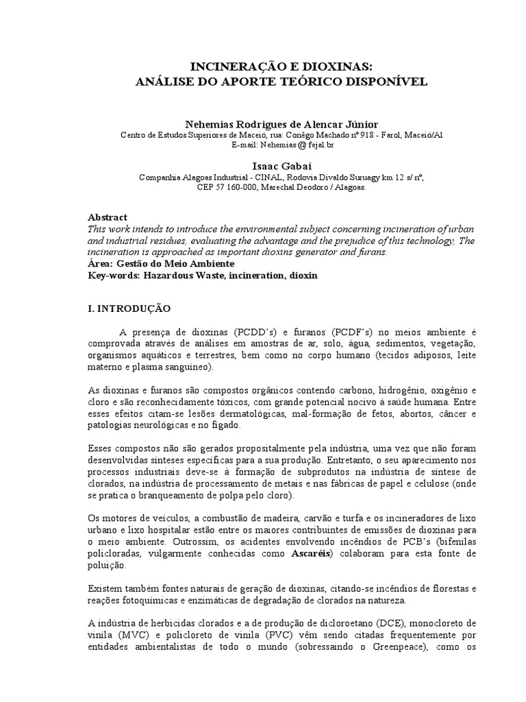 Abstract This work intends to introduce the environmental subject concerning incineration of urban and industrial residues, evaluating the advantage and the prejudice of this technology, The incineration is approached as important dioxins generator and furans. rea: Gesto do Meio Ambiente Key-words: Hazardous Waste, incineration, dioxin I. INTRODUO A presena de dioxinas (PCDDs) e furanos (PCDFs) no meios ambiente comprovada atravs de anlises em amostras de ar, solo, gua, sedimentos, vegetao, organismos aquticos e terrestres, bem como no corpo humano (tecidos adiposos, leite materno e plasma sanguneo). As dioxinas e furanos so compostos orgnicos contendo carbono, hidrognio, oxignio e cloro e so reconhecidamente txicos, com grande potencial nocivo sade humana. Entre esses efeitos citam-se leses dermatolgicas, mal-formao de fetos, abortos, cncer e patologias neurolgicas e no fgado. Esses compostos no so gerados propositalmente pela indstria, uma vez que no foram desenvolvidas snteses especficas para a sua produo. Entretanto, o seu aparecimento nos processos industriais deve-se formao de subprodutos na indstria de sntese de clorados, na indstria de processamento de metais e nas fbricas de papel e celulose (onde se pratica o branqueamento de polpa pelo cloro). Os motores de veculos, a combusto de madeira, carvo e turfa e os incineradores de lixo urbano e lixo hospitalar esto entre os maiores contribuintes de emisses de dioxinas para o meio ambiente. Outrossim, os acidentes envolvendo incndios de PCBs (bifenilas policloradas, vulgarmente conhecidas como Ascaris) colaboram para esta fonte de poluio. Existem tambm fontes naturais de gerao de dioxinas, citando-se incndios de florestas e reaes fotoqumicas e enzimticas de degradao de clorados na natureza. A indstria de herbicidas clorados e a de produo de dicloroetano (DCE), monocloreto de vinila (MVC) e policloreto de vinila (PVC) vm sendo citadas frequentemente por entidades ambientalistas de todo o mundo (sobressaindo o Greenpeace), como os