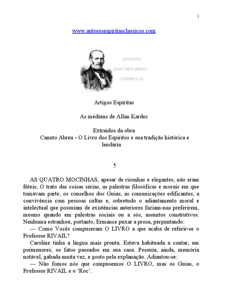 Artigos Espíritas As médiuns de Allan Kardec Extraídos da obra Canuto Abreu - O Livro dos Espíritos e sua tradiç o !ist"rica e lend#ria $ A% &'A()O *OC+,-A%. apesar de rison!as e elegantes. n o eram /0teis. O trato das coisas sérias. as palestras /ilos"/icas e morais em 1ue tomavam parte. os consel!os dos 2uias. as comunicaç3es edi/icantes. a conviv4ncia com pessoas cultas e. sobretudo o adiantamento moral e intelectual 1ue possuíam de exist4ncias anteriores /a5iam-nas pre/erirem. mesmo 1uando em palestras sociais ou a s"s. assuntos construtivos. ,en!uma estran!ou. portanto. Ermance puxar a prosa. perguntando6 7 Como 8oc4s compuseram O L+8)O a 1ue acaba de re/erir-se o 9ro/essor )+8A+L: Caroline tin!a a língua mais pronta. Estava !abituada a contar. em pormenores. os /atos passados em sua casa. 9ossuía. ainda. mem"ria not#vel. gabada muita ve5. e gosto pela explanaç o. Adiantou-se6 7 , o /omos n"s 1ue compusemos O L+8)O. mas os 2uias. o 9ro/essor )+8A+L e o ;)oc<.