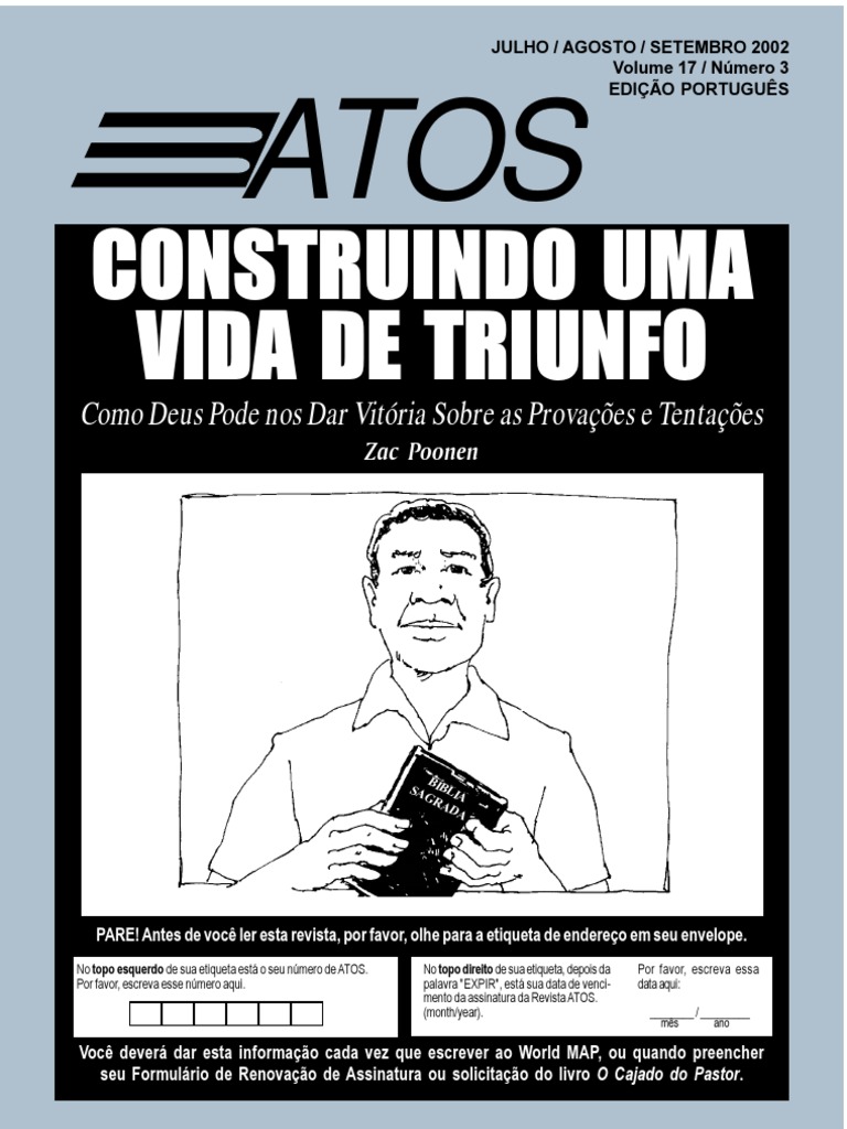 ATOS, no original, (ISSN 0744-1789) publicada a cada trs meses pelo World MAP, 1419 N. San Fernando Blvd., Burbank, CA 91504, EUA. Toda correspondncia deve ser dirigida para o endereo acima ou para Caixa Postal 5053, 31611-970 Venda Nova, MG, Brasil ou ainda para o e-mail: vanderb.santos@bol.com.br SR. AGENTE POSTAL: Favor enviar as mudanas de endereo para World MAP, Caixa Postal 5053, 31611-970 Venda Nova, MG, Brasil. Todas as passagens das Escrituras sero da Bblia Sagrada, traduzida em portugus por Joo Ferreira de Almeida Sociedade Bblica do Brasil 1981, a menos que outra fonte seja indicada.