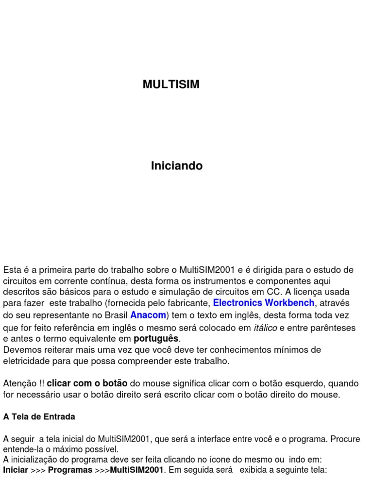 Iniciar >>> Programas >>>MultiSIM2001. Em seguida será exibida a seguinte tela: