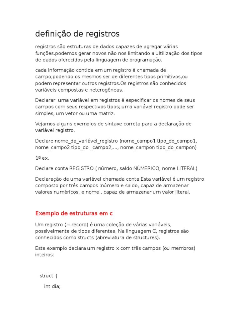 registros so estruturas de dados capazes de agregar vrias funes.podemos gerar novos no nos limitando a ultilizao dos tipos de dados oferecidos pela linguagem de programao. cada informao contida em um registro chamada de campo,podendo os mesmos ser de diferentes tipos primitivos,ou podem representar outros registros.Os registros so conhecidos variveis compostas e heterogneas. Declarar uma varivel em registros especificar os nomes de seus campos com seus respectivos tipos; uma varivel registro pode ser simples, um vetor ou uma matriz. e!amos alguns e"emplos de sinta"e correta para a declarao de varivel registro. Declare nome#da#varivel#registro $nome#campo% tipo#do#campo%, nome#campo& tipo#do #campo&,..., nome#campon tipo#do#campon' %( e". Declare conta )*+,-.)O $ n/mero, saldo 012*),3O, nome 4,.*)54' Declarao de uma varivel chamada conta.*sta varivel um registro composto por trs campos 6n/mero e saldo, capaz de armazenar valores numricos, e nome , capaz de armazenar um valor literal.