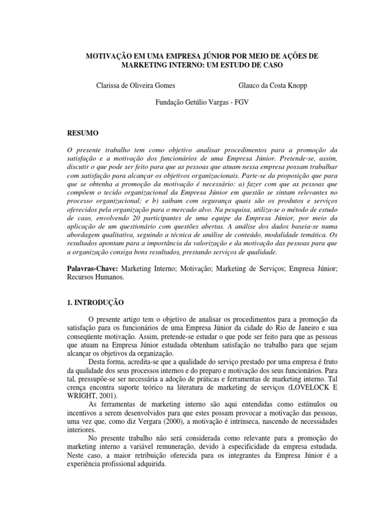 O presente artigo tem o objetivo de analisar os procedimentos para a promoção da satisfação para os funcionários de uma Empresa Júnior da cidade do Rio de Janeiro e sua conseqüente motivação. Assim, pretende-se estudar o que pode ser feito para que as pessoas que atuam na Empresa Júnior estudada obtenham satisfação no trabalho para que sejam alcançar os objetivos da organização. Desta forma, acredita-se que a qualidade do serviço prestado por uma empresa é fruto da qualidade dos seus processos internos e do preparo e motivação dos seus funcionários. Para tal, pressupõe-se ser necessária a adoção de práticas e ferramentas de marketing interno. Tal crença encontra suporte teórico na literatura de marketing de serviços (LOVELOCK E WRIGHT, 2001). As ferramentas de marketing interno são aqui entendidas como estímulos ou incentivos a serem desenvolvidos para que estes possam provocar a motivação das pessoas, uma vez que, como diz Vergara (2000), a motivação é intrínseca, nascendo de necessidades interiores. No presente trabalho não será considerada como relevante para a promoção do marketing interno a variável remuneração, devido à especificidade da empresa estudada. Neste caso, a maior retribuição oferecida para os integrantes da Empresa Júnior é a experiência profissional adquirida.