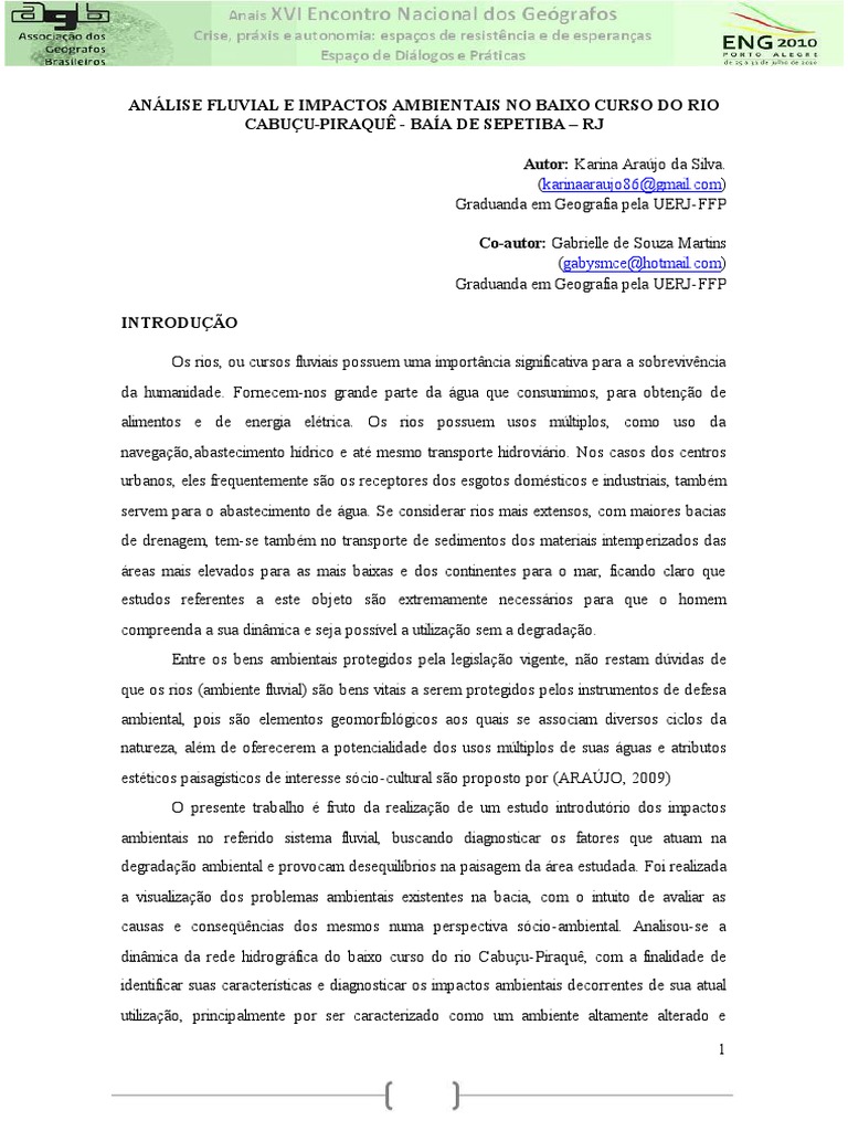 .com) Graduanda em Geografia pela UERJ-FFP Co-autor: Gabrielle de Souza Martins (gabysmce@hotmail.com) Graduanda em Geografia pela UERJ-FFP INTRODUO Os rios, ou cursos fluviais possuem uma importncia significativa para a sobrevivncia da humanidade. Fornecem-nos grande parte da gua que consumimos, para obteno de alimentos e de energia eltrica. Os rios possuem usos mltiplos, como uso da navegao,abastecimento hdrico e at mesmo transporte hidrovirio. Nos casos dos centros urbanos, eles frequentemente so os receptores dos esgotos domsticos e industriais, tambm servem para o abastecimento de gua. Se considerar rios mais extensos, com maiores bacias de drenagem, tem-se tambm no transporte de sedimentos dos materiais intemperizados das reas mais elevados para as mais baixas e dos continentes para o mar, ficando claro que estudos referentes a este objeto so extremamente necessrios para que o homem compreenda a sua dinmica e seja possvel a utilizao sem a degradao. Entre os bens ambientais protegidos pela legislao vigente, no restam dvidas de que os rios (ambiente fluvial) so bens vitais a serem protegidos pelos instrumentos de defesa ambiental, pois so elementos geomorfolgicos aos quais se associam diversos ciclos da natureza, alm de oferecerem a potencialidade dos usos mltiplos de suas guas e atributos estticos paisagsticos de interesse scio-cultural so proposto por (ARAJO, 2009) O presente trabalho fruto da realizao de um estudo introdutrio dos impactos ambientais no referido sistema fluvial, buscando diagnosticar os fatores que atuam na degradao ambiental e provocam desequilbrios na paisagem da rea estudada. Foi realizada a visualizao dos problemas ambientais existentes na bacia, com o intuito de avaliar as causas e conseqncias dos mesmos numa perspectiva scio-ambiental. Analisou-se a dinmica da rede hidrogrfica do baixo curso do rio Cabuu-Piraqu, com a finalidade de identificar suas caractersticas e diagnosticar os impactos ambientais decorrentes de sua atual utilizao, principalmente por ser caracterizado como um ambiente altamente alterado e 1