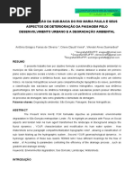 degradado pela ao antrpica. O perfil geomorfolgico foi analisado com base os estudos sobre Geomorfologia Fluvial, principalmente no que se refere fisiografia fluvial, na delimitao dos tipos de canais e de rede de drenagem. Realizando uma breve identificao geomorfolgica da rea, de acordo com os padres de caracterizao propostos por CUNHA (2007), o tipo de canal pode ser considerado retilneo e seu padro de drenagem do tipo exorrico. O rio apresenta mudanas em sua dinmica por causa da canalizao, aliada ao crescimento populacional de urbanizao, sendo mais expressivo a partir do seu mdio curso. J seu baixo curso caracteriza-se pela presena de um crescimento populacional desordenado e acelerado, causando diversas obras de aterros, retilinizao, alargamento e aprofundamento na sua dinmica, desfigurando suas caractersticas naturais e possibilitando a ocorrncia de ambientes associados, como brejos e mangues. Essas transformaes alteraram a circulao na baa, acrescentando o poder da eroso e capacidade de transporte de sedimentos pelo rio, acelerando, assim, a taxa de assoreamento dentro da baa. (AMADOR, 1980). Alm das modificaes fsicas do rio, a falta de saneamento uma grande dificuldade para todos os moradores da regio, gerando impactos nas caractersticas naturais do rio, sendo considerado como uns dos ambientes mais degradados pela Zona Oeste. Dessa forma, o estudo contribui na verificao dos impactos ambientais tambm na qualidade da gua, buscando gerar medidas e propostas para a comunidade e rgos competentes com a finalidade nica de promover o uso racional dos recursos naturais existentes no Municpio para a confeco de um planejamento eficaz e coerente. Nesse aspecto, algumas reflexes sobre o espao urbano e a urbanizao tambm se fazem necessrias, no intuito de trazer tona discusses sobre planejamento urbano e uso e ocupao do solo. METODOLOGIA Para o desenvolvimento deste trabalho tivemos como meta a anlise dos impactos ambientais do rio Cabuu-Piraqu, com nfase no seu baixo curso, inserido em reas urbanas. Neste trabalho, foram realizados trabalhos de campo visando observao de aspectos como vegetao, solo e biodiversidade, alm de anlises superficiais de qualidade 2