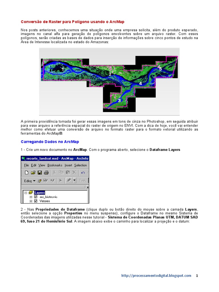 2 - Nas Propriedades do Dataframe (clique duplo ou boto direito do mouse sobre a camada Layers, ento selecione a opo Properties no menu suspenso), configure o Dataframe no mesmo Sistema de Coordenadas das imagens utilizadas nesse tutorial - Sistema de Coordenadas Planas UTM, DATUM SAD 69, fuso 21 do Hemisfrio Sul. A imagem abaixo exibe o caminho para localizar a projeo e o datum: