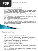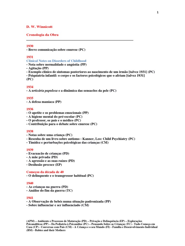 3 1949 The Ordinary Devoted Mother and her Baby - Leucotomia (EP) - Resenha do Livro de Adrian Hill: Art Versus lliness (EP) - Memrias do nascimento, trauma do nascimento e angstia (PP) - A mente e sua relao com o psicossoma (PP) - O beb como organizao em marcha (CM) - O beb como pessoa (CM) - Pormenores da alimentao do beb pela me (CM) - O fim do processo digestivo (CM) - A moralidade inata do beb (CM) - Educao sexual nas escolas (CM) - O desmame (CM) - Para onde vai o alimento (CM) - O mundo em pequenas doses (CM) - As crianas e as outras pessoas (CM) (dcada de 50) Ideias e definies (EP) 1950 - A criana privada e como compens-la pela perda da vida de um familiar (PD) - A agressividade e o desenvolvimento emocional (PP) - "Sim, mas como que sabemos que verdade?" (PC) - Algunas reflexes sobre o significado da palavra "democracia" (TC) - Atendimento de crianas mentalmente perturbadas atendimento e psicoterapia (FI) - As influncias do grupo e a criana desajustada (FI) 1951 - As bases da sade mental (PD) - Marion Milner - Nota crtica de On Not Being Able to Paint (EP) - Notas sobre as implicaes gerais da leucotomia (EP) - Objectos transicionais e fenmenos transicionais (PP) 1952 - Ansiedade associada insegurana (PP) - Psicoses e cuidados maternos (PP) - Visitando crianas hospitalizadas (CM) 1953 - Dorothy Burlingham - resenha de A Study of Three Pairs of Identical Twins (EP) - W.R.D. Fairbairn - resenha de Psycho-Analytic Studies of the Personality (EP) - John Bowlby - resenha de Maternal Care and Mental Health (EP) - Tolerncia ao sintoma em pediatria: relato de um caso (PP) - As crianas adoptadas (PC) - A Me, a professora e as necessidades da criana (CM) - Objetos transicionais e fenmenos transicionais (em O brincar e a realidade) 1954 - O brinquedo na situao analtica (EP) - Michael Balint - Tipos de Carter: O Temerrio e o Cauteloso (EP) - Retraimento e regresso (PP) - A posio depressiva no desenvolvimento emocional normal (PP)