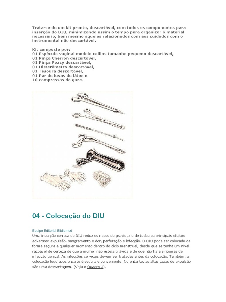 Equipe Editorial Bibliomed Uma insero correta do DIU reduz os riscos de gravidez e de todos os principais efeitos adversos: expulso, sangramento e dor, perfurao e infeco. O DIU pode ser colocado de forma segura a qualquer momento dentro do ciclo menstrual, desde que se tenha um nvel razovel de certeza de que a mulher no esteja grvida e de que no haja sintomas de infeco genital. As infeces cervicais devem ser tratadas antes da colocao. Tambm, a colocao logo aps o parto segura e conveniente. No entanto, as altas taxas de expulso so uma desvantagem. (Veja o Quadro 3).