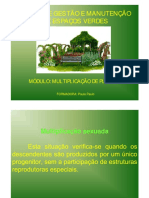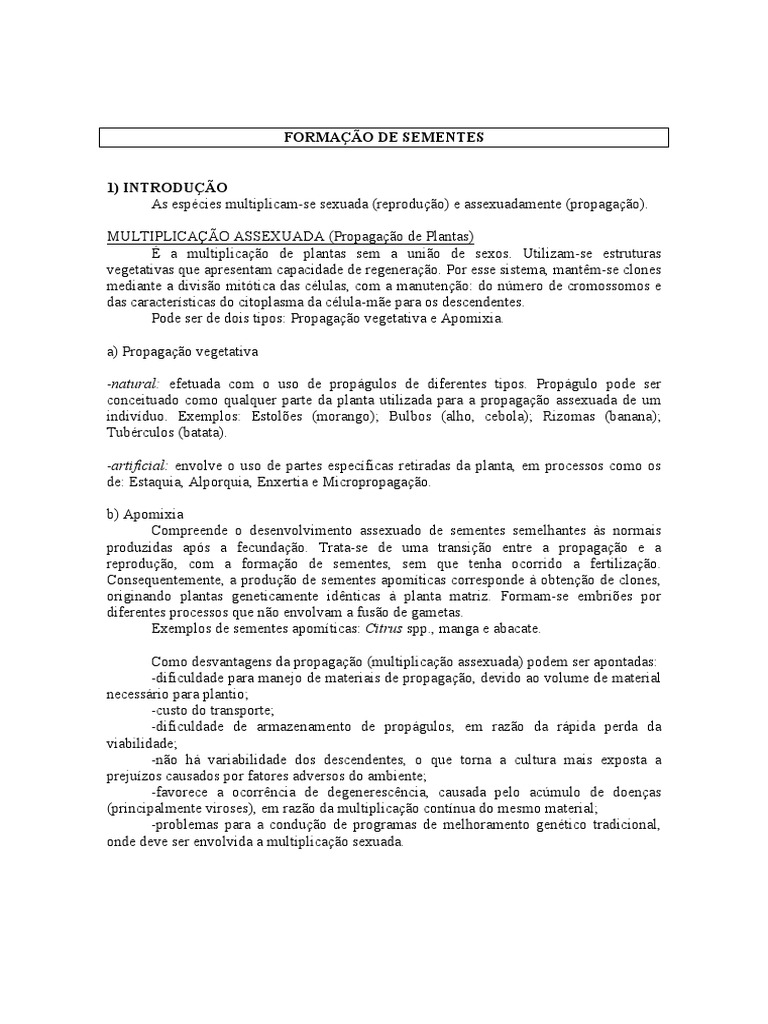 1) I TRODUO As espcies multiplicam-se sexuada (reproduo) e assexuadamente (propagao). MULTIPLICAO ASSEXUADA (Propagao de Plantas) a multiplicao de plantas sem a unio de sexos. Utilizam-se estruturas vegetativas que apresentam capacidade de regenerao. Por esse sistema, mantm-se clones mediante a diviso mittica das clulas, com a manuteno: do nmero de cromossomos e das caractersticas do citoplasma da clula-me para os descendentes. Pode ser de dois tipos: Propagao vegetativa e Apomixia. a) Propagao vegetativa -natural: efetuada com o uso de propgulos de diferentes tipos. Propgulo pode ser conceituado como qualquer parte da planta utilizada para a propagao assexuada de um indivduo. Exemplos: Estoles (morango); Bulbos (alho, cebola); Rizomas (banana); Tubrculos (batata). -artificial: envolve o uso de partes especficas retiradas da planta, em processos como os de: Estaquia, Alporquia, Enxertia e Micropropagao. b) Apomixia Compreende o desenvolvimento assexuado de sementes semelhantes s normais produzidas aps a fecundao. Trata-se de uma transio entre a propagao e a reproduo, com a formao de sementes, sem que tenha ocorrido a fertilizao. Consequentemente, a produo de sementes apomticas corresponde obteno de clones, originando plantas geneticamente idnticas planta matriz. Formam-se embries por diferentes processos que no envolvam a fuso de gametas. Exemplos de sementes apomticas: Citrus spp., manga e abacate. Como desvantagens da propagao (multiplicao assexuada) podem ser apontadas: -dificuldade para manejo de materiais de propagao, devido ao volume de material necessrio para plantio; -custo do transporte; -dificuldade de armazenamento de propgulos, em razo da rpida perda da viabilidade; -no h variabilidade dos descendentes, o que torna a cultura mais exposta a prejuzos causados por fatores adversos do ambiente; -favorece a ocorrncia de degenerescncia, causada pelo acmulo de doenas (principalmente viroses), em razo da multiplicao contnua do mesmo material; -problemas para a conduo de programas de melhoramento gentico tradicional, onde deve ser envolvida a multiplicao sexuada.