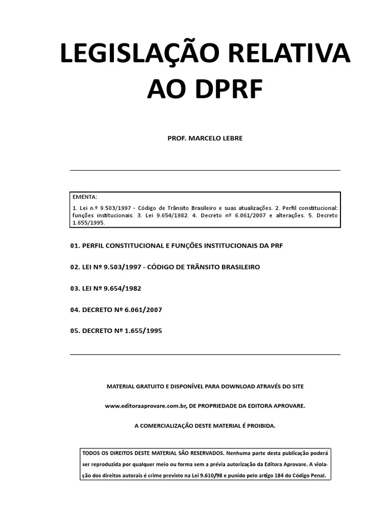 EMENTA: 1. Lei n. 9.503/1997 - Cdigo de Trnsito Brasileiro e suas atualizaes. 2. Perfil constitucional: funes institucionais. 3. Lei 9.654/1982. 4. Decreto n 6.061/2007 e alteraes. 5. Decreto 1.655/1995.