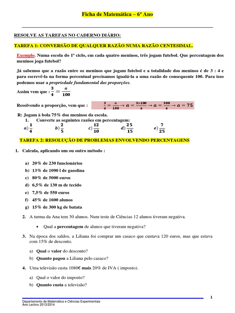 RESOLVE AS TAREFAS NO CADERNO DIRIO: TAREFA 1: CONVERSO DE QUALQUER RAZO NUMA RAZO CENTESIMAL. Exemplo. Numa escola do 1 ciclo, em cada quatro meninos, trs jogam futebol. Que percentagem dos meninos joga futebol? J sabemos que a razo entre os meninos que jogam futebol e a totalidade dos meninos de 3 : 4 e para escrev-la na forma percentual precisamos igual-la a uma razo de consequente 100. Para isso podemos usar a propriedade fundamental das propores. Assim vem que : Resolvendo a proporo, vem que : R: Jogam bola 75% dos meninos da escola. 1. Converte as seguintes razes em percentagem: