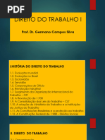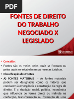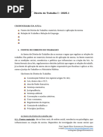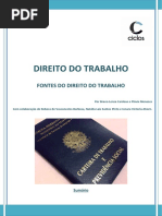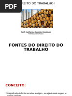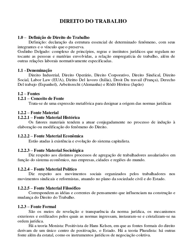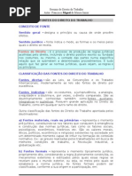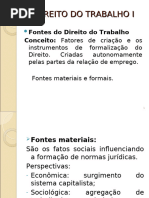 1.0 Definio de Direito do Trabalho Definio: declarao da estrutura essencial de determinado fenmeno, com seus integrantes e o vnculo que o preserva. Godinho Delgado: complexo de princpios, regras e institutos jurdicos que regulam no tocante as pessoas e matrias envolvidas, a relao empregatcia de trabalho, alm de outras relaes laborais normativamente especificadas. 1.1 - Denominao Direito Industrial, Direito Operrio, Direito Corporativo, Direito Sindical, Direito Social, Labor Law (EUA), Diritto Del lavoro (Itlia), Droit Du travail (Frana), Derecho Del trabajo (Espanhol), Arbeitsrecht (Alemanha) e Rd Hritsu (Japo) 1.2 Fontes 1.2.1 Conceito de Fonte Trata-se de uma expresso metafrica para designar a origem das normas jurdicas 1.2.2 Fonte Material [Link] Fonte Material Histrica Os fatores materiais tendem a atuar conjugadamente no processo de induo elaborao ou modificao do fenmeno do Direito. [Link] Fonte Material Econmica Esto atadas existncia e evoluo do sistema capitalista. [Link] Fonte Material Sociolgica Diz respeito aos distintos processos de agregao de trabalhadores assalariados em funo do sistema econmico, nas empresas, cidades e regies do mundo. [Link] Fonte Material Poltico Diz respeito aos movimentos sociais organizados pelos trabalhadores nos movimentos sindicais e reformistas, atuando no plano da sociedade civil e do Estado. [Link] Fonte Material Filosfico Correspondem as idias e correntes de pensamento que influenciam na construo e mudana do Direito do Trabalho. 1.2.3 Fonte Formal So os meios de revelao e transparncia da norma jurdica, os mecanismos exteriores e estilizados pelos quais as normas ingressam, instauram-se e cristalizam-se na ordem jurdica. H a teoria Monista: Positivista de Hans Kelsen, em que as fontes formais do direito derivam de um nico centro de positivao, o Estado. H a teoria Pluralista: h outras fonte alm da estatal, como os instrumentos jurdicos de negociao coletiva.