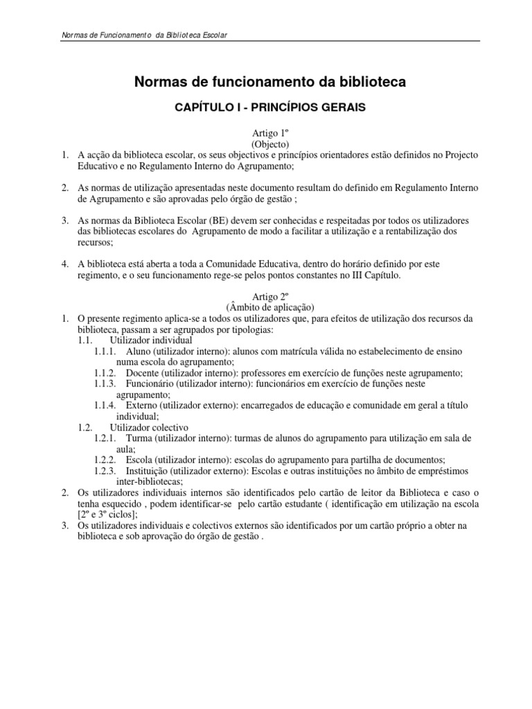 1. A acção da biblioteca escolar, os seus objectivos e princípios orientadores estão definidos no Projecto