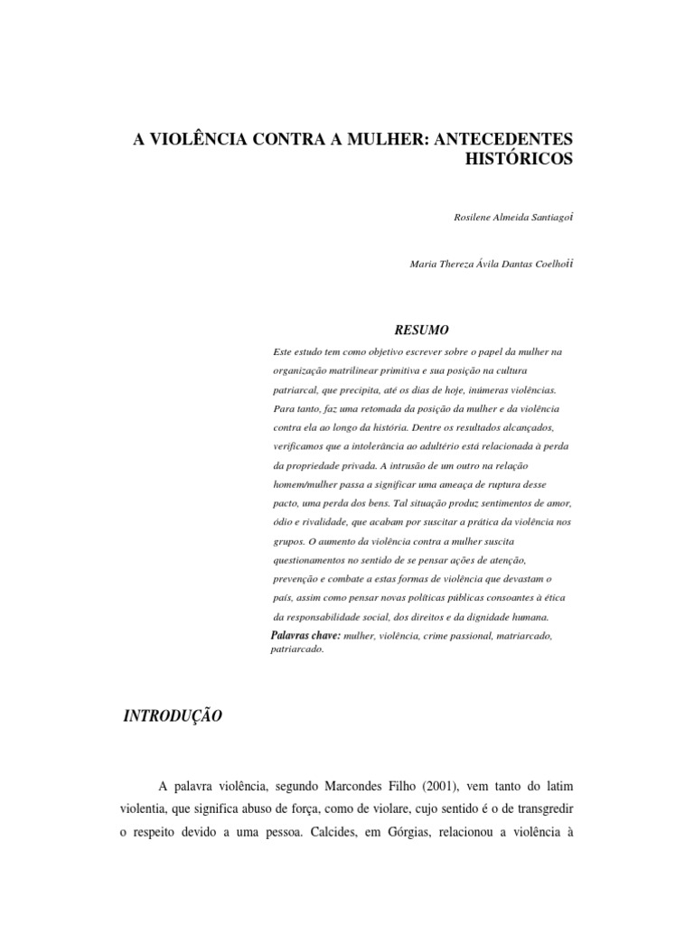 Este estudo tem como objetivo escrever sobre o papel da mulher na organizao matrilinear primitiva e sua posio na cultura patriarcal, que precipita, at os dias de hoje, inmeras violncias. Para tanto, faz uma retomada da posio da mulher e da violncia contra ela ao longo da histria. Dentre os resultados alcanados, verificamos que a intolerncia ao adultrio est relacionada perda da propriedade privada. A intruso de um outro na relao homem/mulher passa a significar uma ameaa de ruptura desse pacto, uma perda dos bens. Tal situao produz sentimentos de amor, dio e rivalidade, que acabam por suscitar a prtica da violncia nos grupos. O aumento da violncia contra a mulher suscita questionamentos no sentido de se pensar aes de ateno, preveno e combate a estas formas de violncia que devastam o pas, assim como pensar novas polticas pblicas consoantes tica da responsabilidade social, dos direitos e da dignidade humana. Palavras chave: mulher, violncia, crime passional, matriarcado, patriarcado.