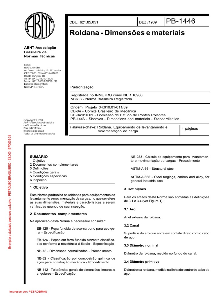 Este documento estabelece normas para roldanas usadas em equipamentos de levantamento e movimentação de cargas, definindo suas dimensões, materiais, características e procedimentos de inspeção. As roldanas devem ser fabricadas em aço ou ferro fundido, atendendo especificações de materiais. Suas dimensões principais como diâmetro, ângulo e dimensões do canal devem seguir padrões, e a roldana deve ser designada indicando essas características e o material. A inspeção inclui verificação visual, dimensional, de