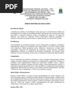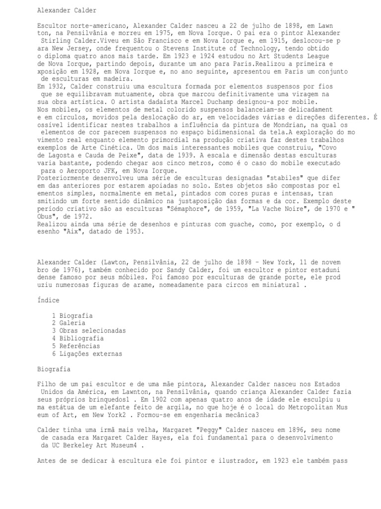 Iorque. O pai era o pintor Alexander Stirling [Link] em So Francisco e em Nova Iorque e, em 1915, deslocou-se p ara New Jersey, onde frequentou o Stevens Institute of Technology, tendo obtido o diploma quatro anos mais tarde. Em 1923 e 1924 estudou no Art Students League de Nova Iorque, partindo depois, durante um ano para [Link] a primeira e xposio em 1928, em Nova Iorque e, no ano seguinte, apresentou em Paris um conjunto de esculturas em madeira. Em 1932, Calder construiu uma escultura formada por elementos suspensos por fios que se equilibravam mutuamente, obra que marcou definitivamente uma viragem na sua obra artstica. O artista dadasta Marcel Duchamp designou-a por mobile. Nos mobiles, os elementos de metal colorido suspensos balanceiam-se delicadament e em crculos, movidos pela deslocao do ar, em velocidades vrias e direes diferentes. ossvel identificar nestes trabalhos a influncia da pintura de Mondrian, na qual os elementos de cor parecem suspensos no espao bidimensional da tela.A explorao do mo vimento real enquanto elemento primordial na produo criativa faz destes trabalhos exemplos de Arte Cintica. Um dos mais interessantes mobiles que construiu, "Covo de Lagosta e Cauda de Peixe", data de 1939. A escala e dimenso destas esculturas varia bastante, podendo chegar aos cinco metros, como o caso do mobile executado para o Aeroporto JFK, em Nova Iorque. Posteriormente desenvolveu uma srie de esculturas designadas "stabiles" que difer em das anteriores por estarem apoiadas no solo. Estes objetos so compostas por el ementos simples, normalmente em metal, pintados com cores puras e intensas, tran smitindo um forte sentido dinmico na justaposio das formas e da cor. Exemplo deste perodo criativo so as esculturas "Smaphore", de 1959, "La Vache Noire", de 1970 e " Obus", de 1972. Realizou ainda uma srie de desenhos e pinturas com guache, como, por exemplo, o d esenho "Aix", datado de 1953.