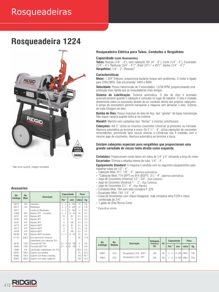 Cortatubos: Proporcionam cortes fceis em tubos de 1/4 a 4 utilizando a fora do motor. Escariador: Elimina a rebarba interna do tubo, 1/4 - 4. Equipamento Standard: A mquina vendida com os seguintes equipamentos para trabalhar tubos de 1/2- 4: Cabeote Mod. 911, 1/8 - 2, (abertura automtica). *Cabeote Mod. 714 (NPT) ou 914 (BSPT), 2- 4, (abertura automtica). Jogo de Cossinetes Universal 1/2- 3/4, (Ao Carbono). Jogo de Cossintes Universal 1 - 2, (Ao Carbono). Jogo de Cossinetes 2- 4, (Ao Rpido). Cortatubo Mod. 764 com roda cortadora F-229. Escariador Mod. 744, 1/4 - 4. Caixa de ferramentas com chave Hexagonal, roda cortadora extra F229 e chave combinada de 3/4. 1 galo de leo Rosca-Corte.