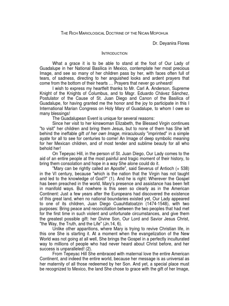 Deyanira Flores INTRODUCTION What a grace it is to be able to stand at the foot of Our Lady of Guadalupe in her National Basilica in Mexico, contemplate her most precious Image, and see so many of her children pass by her, with faces often full of tears, of sadness, directing to her anguished looks and ardent prayers that come from the bottom of their hearts … Prayers that never go unheard! I wish to express my heartfelt thanks to Mr. Carl A. Anderson, Supreme Knight of the Knights of Columbus, and to Msgr. Eduardo Chávez Sánchez, Postulator of the Cause of St. Juan Diego and Canon of the Basilica of Guadalupe, for having granted me the honor and the joy to participate in this I International Marian Congress on Holy Mary of Guadalupe, to whom I owe so many blessings! The Guadalupean Event is unique for several reasons: Since her visit to her kinswoman Elizabeth, the Blessed Virgin continues "to visit" her children and bring them Jesus, but to none of them has She left behind the ineffable gift of her own Image, miraculously "imprinted" in a simple ayate for all to see for centuries to come! An Image of deep symbolic meaning for her Mexican children, and of most tender and sublime beauty for all who behold her! On Tepeyac Hill, in the person of St. Juan Diego, Our Lady comes to the aid of an entire people at the most painful and tragic moment of their history, to bring them consolation and hope in a way She alone could do it. "Mary can be rightly called an Apostle", said Severus of Antioch (+ 538) in the VI century, because "which is the nation that the Virgin has not taught and led to the knowledge of God?" (1). And he is right: Wherever the Gospel has been preached in the world, Mary's presence and assistance has been felt in manifold ways. But nowhere is this seen so clearly as in the American Continent: Just a few years after the Europeans had discovered the existence of this great land, when no national boundaries existed yet, Our Lady appeared to one of its children, Juan Diego Cuauhtlatoatzin (1474-1548), with two purposes: Bring peace and reconciliation between the two peoples that had met for the first time in such violent and unfortunate circumstances, and give them the greatest possible gift: her Divine Son, Our Lord and Savior Jesus Christ, "the Way, the Truth, and the Life" (Jn.14, 6). Unlike other apparitions, where Mary is trying to revive Christian life, in this one She is starting it. At a moment when the evangelization of the New World was not going at all well, She brings the Gospel in a perfectly inculturated way to millions of people who had never heard about Christ before, and her success is unparalleled! (2). From Tepeyac Hill She embraced with maternal love the entire American Continent, and indeed the entire world, because her message is as universal as her maternity of all those redeemed by her Son. And yet, a special place must be recognized to Mexico, the land She chose to grace with the gift of her Image,