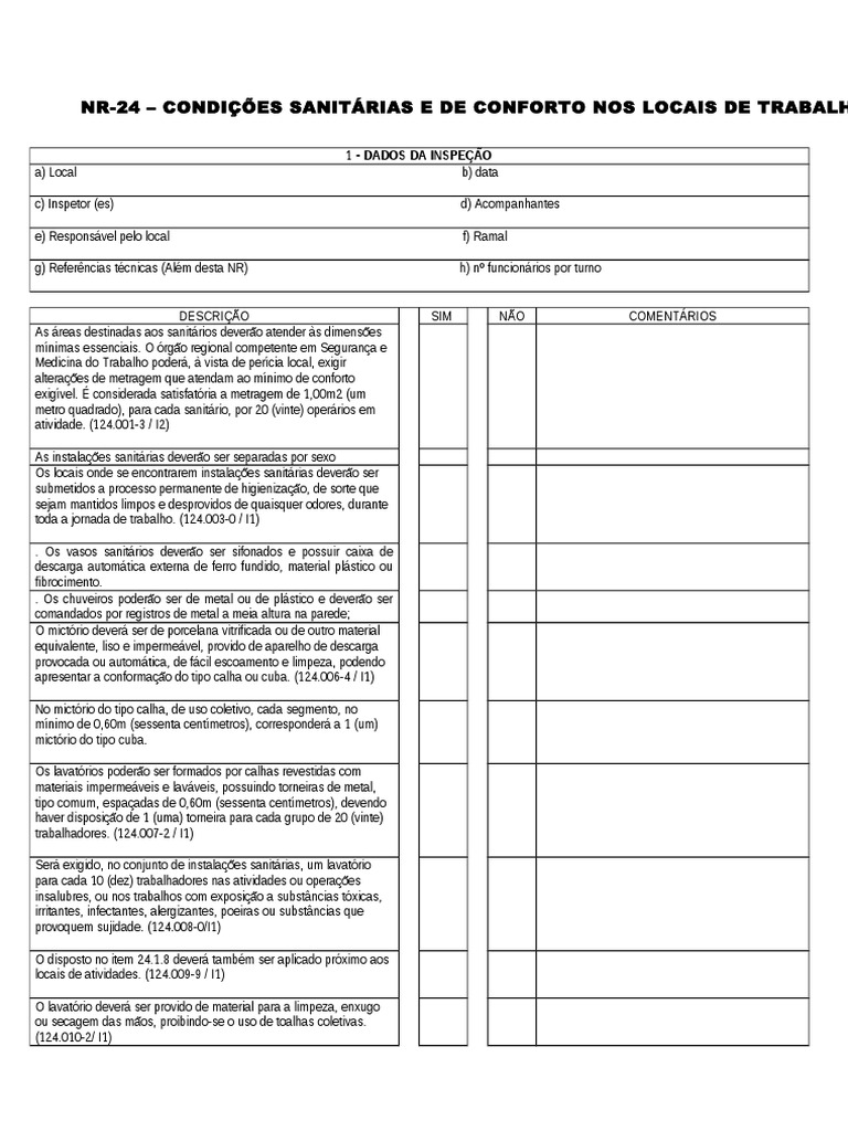 a) Local c) Inspetor (es) e) Responsvel pelo local g) Referncias tcnicas (Alm desta NR)